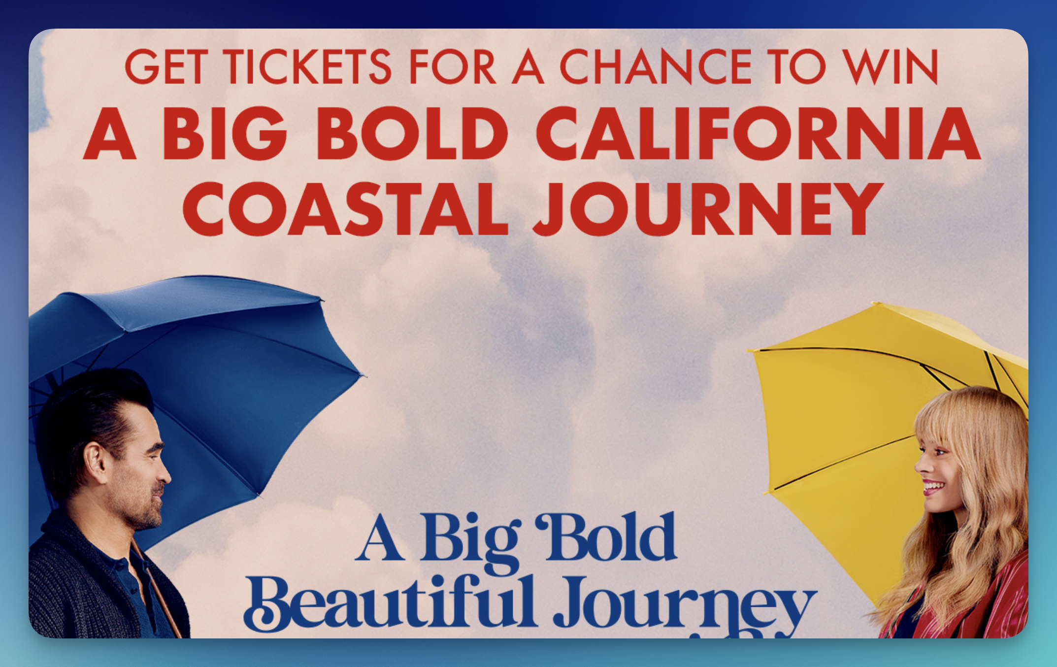 • Email – send your full name, phone number, and Regal Crown Club card number (if any) to RCCSweepstakes@regalcinemas.com with “A Big Bold Beautiful Road Trip Sweepstakes” in the subject line.