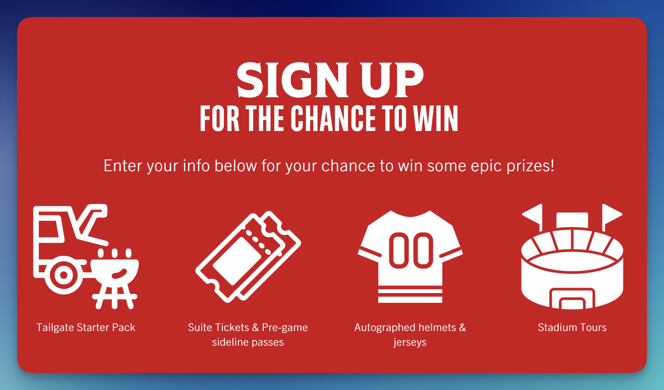 - (1 per team) First Prizes: Two tickets to an NFL game, $100 ride-hailing gift card, and a tax-offset check (ARV varies)