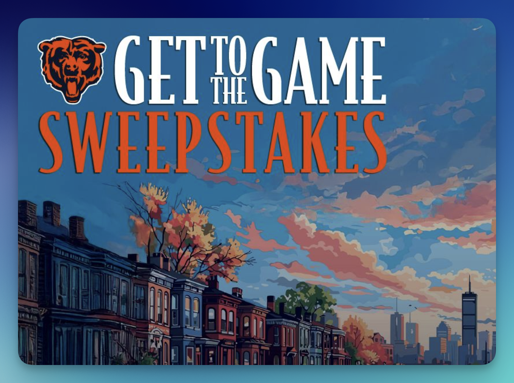 One winner will be selected in the Chicago Bears “Get to the Game” Sweepstakes to enjoy a trip for two to see the Bears take on the Ravens in Baltimore (ARV $2,900)!