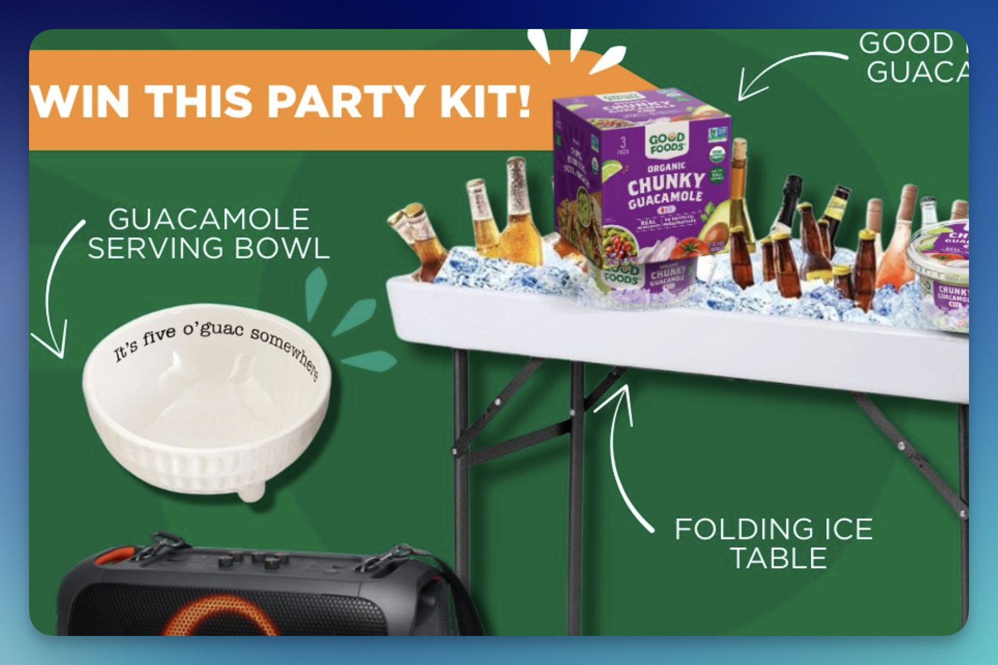 - (1) Grand Prize: JBL Partybox On-The-Go Speaker, Folding Ice Table Cooler, “It’s Five O’Guac Somewhere” Bowl, and Good Foods Dips
