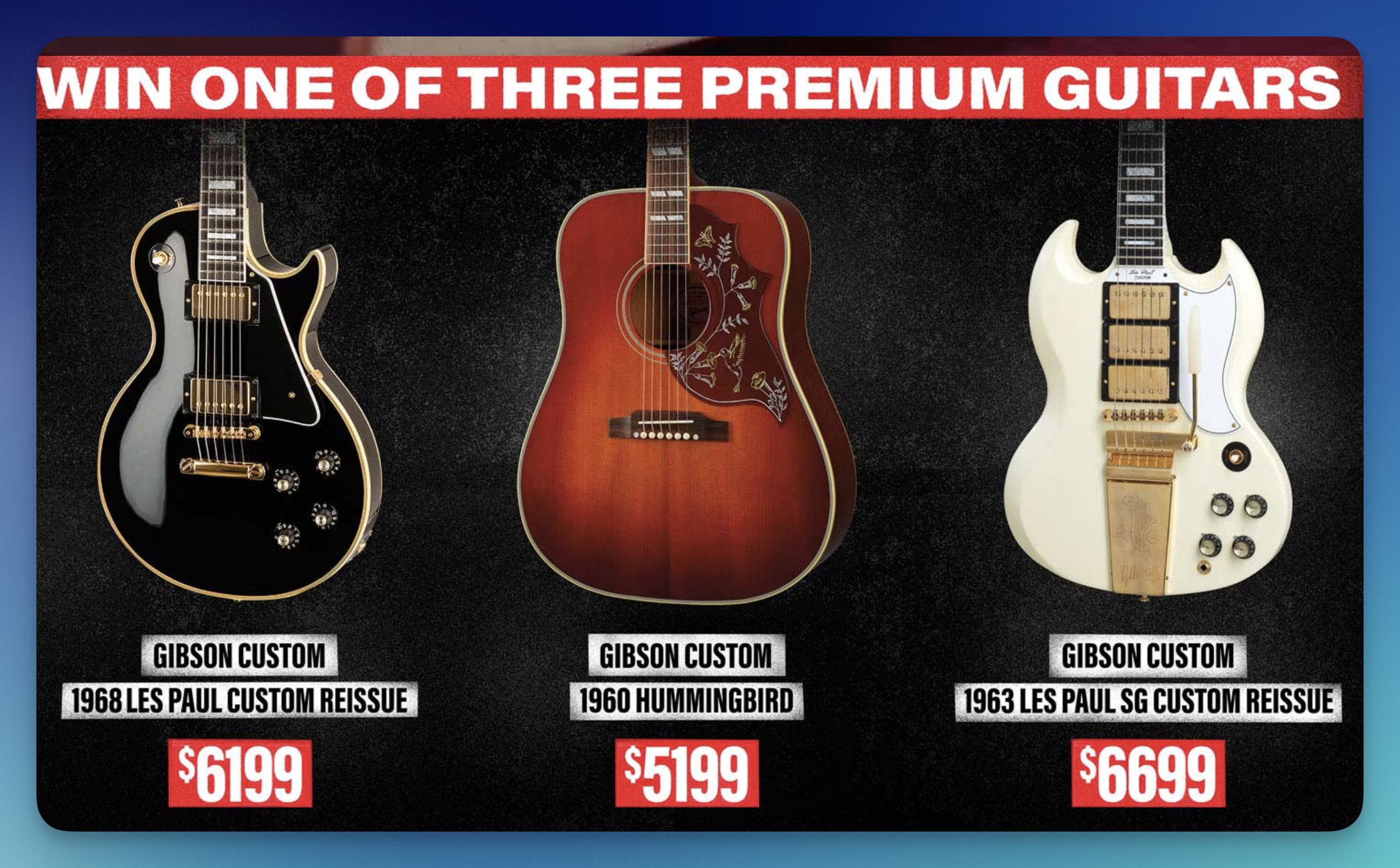 - (1) Second Prize: Gibson 1960 Hummingbird acoustic guitar with fixed bridge in Heritage Cherry Sunburst (ARV $5,199). Total prize value $18,097.