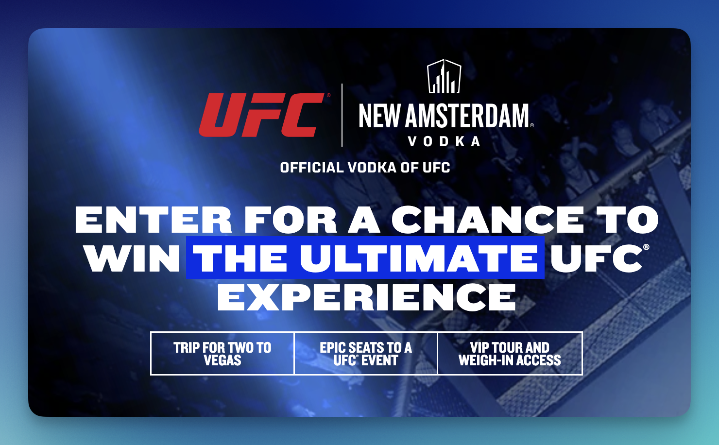Fight fans, don’t miss the New Amsterdam & UFC Q3 Sweepstakes where weekly winners will score UFC prizes—and one winner will take home a VIP Vegas trip!