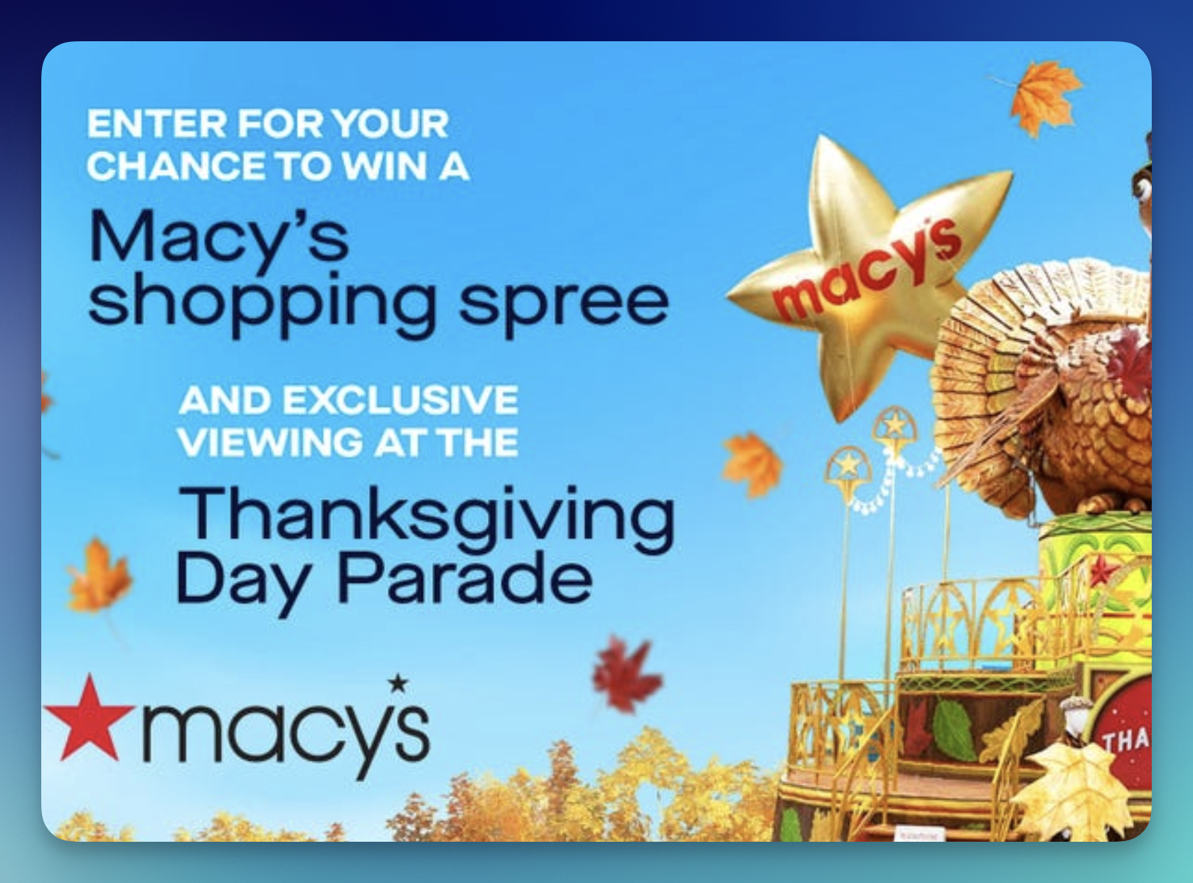 (1) Grand Prize Winner will receive a 2-night trip for two to New York City to attend the Macy’s Thanksgiving Day Parade, including round-trip airfare, hotel accommodations, grandstand viewing passes, and a $1,000 Macy’s gift card (ARV $4,500).