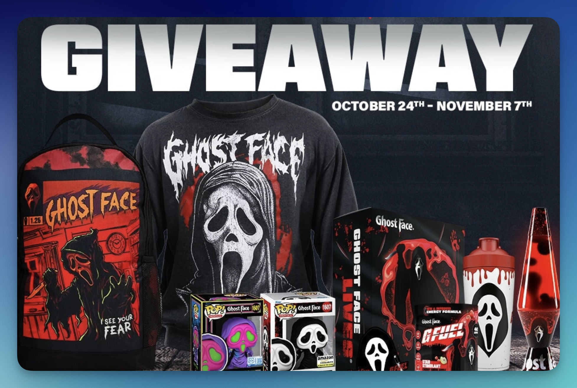 (1) Grand Prize Winner will receive a Ghostface Classic Funko Pop, Ghostface Lava Lamp, Blacklight Ghostface Funko, Ghostface Backpack, Ghostface Sweatshirt, and a G FUEL Ghostface CB (ARV $244.76).