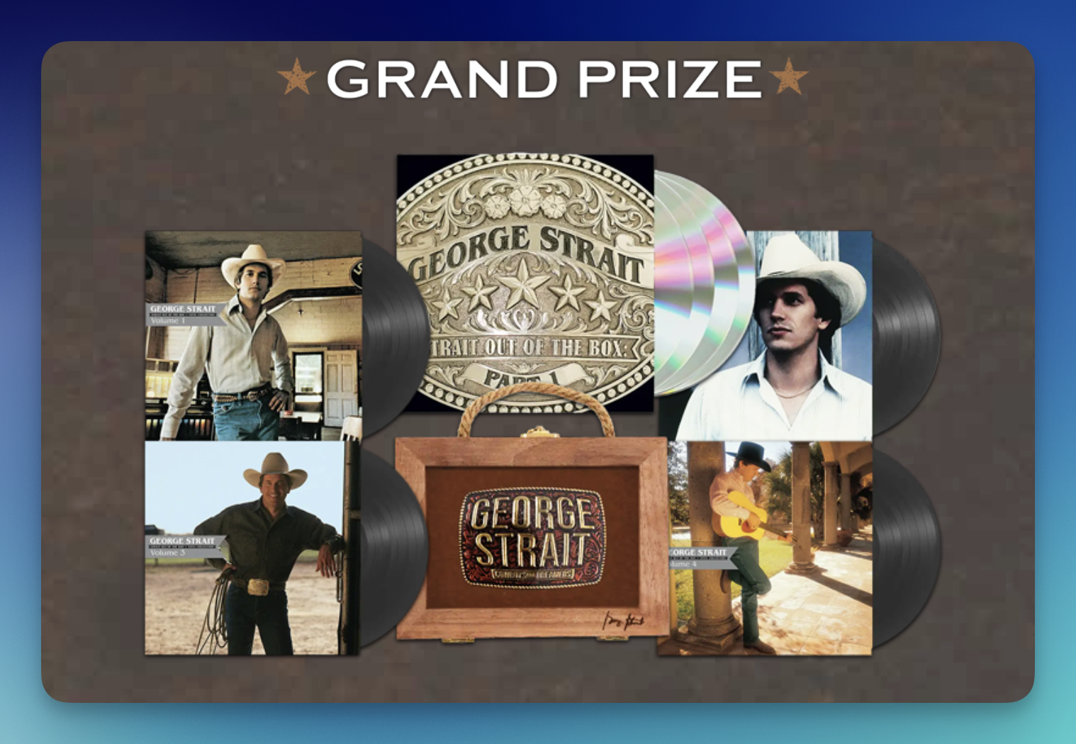 (1) Grand Prize: Strait Out Of The Box Vinyl Collection Volumes 1–4, a Strait Out Of The Box: Part 1 4-CD set, and a Cowboys and Dreamers framed belt buckle (ARV $249.95)