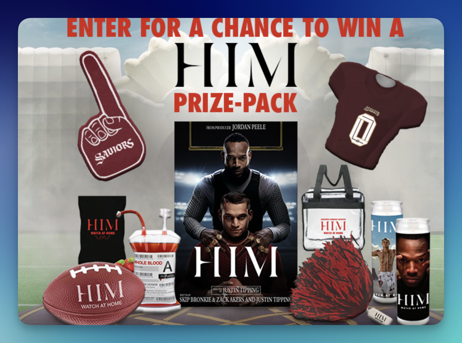 - (1) Grand Prize: A HIM-themed prize pack including gummy strawberries, branded football gear (jersey, eye stickers, foam finger, stress reliever), a clear stadium bag, pom pom, prayer candles, a fake blood bag with syringe, stickers, and a HIM movie digital code (ARV not listed).