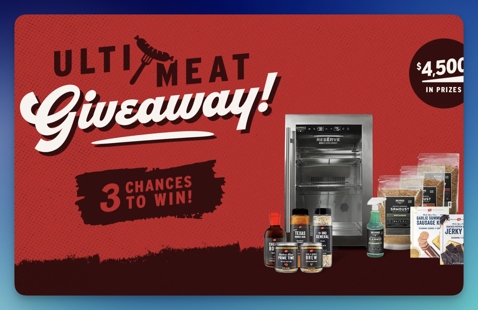 (3) Winners: Each will receive a prize package including a Pro Classic Smoker, Reserve 50 Dry Ager, and a full lineup of PS Seasoning blends (combined value of $4,500 across all prizes)