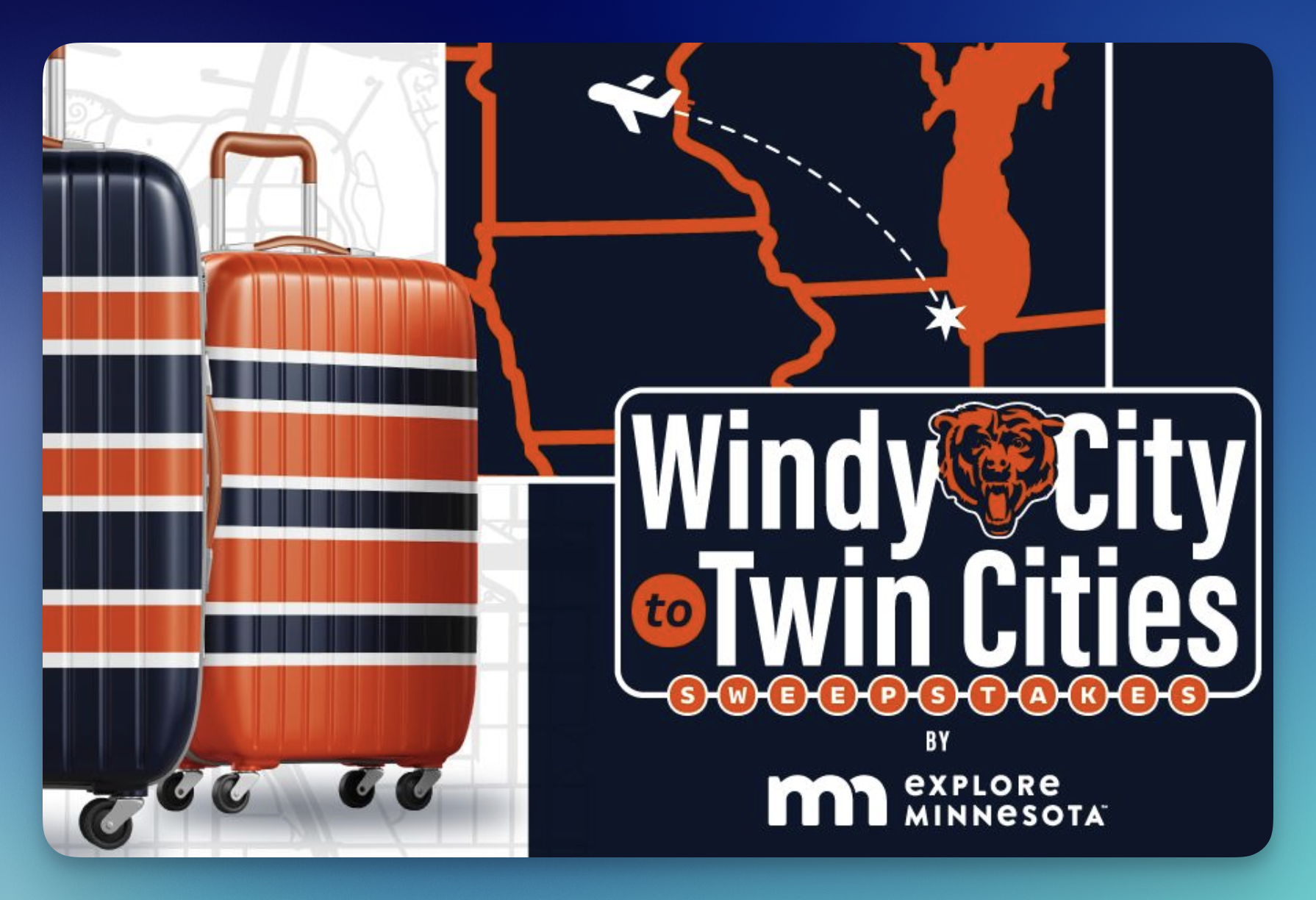 Cheer on your team in person with the Chicago Bears “Windy City to Twin Cities” Sweepstakes — one lucky fan will win a trip for two to see the Bears take on the Vikings in Minneapolis!
