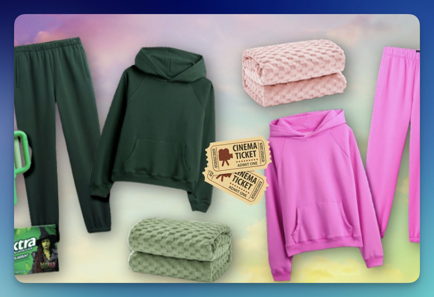 (15) Winners: Each receives 1 Glinda Extra Gum pack, 1 Elphaba Extra Gum pack, 1 pink sweatsuit, 1 green sweatsuit, 2 water bottles, 2 blankets, and a gift card to a local theater to see Wicked: For Good