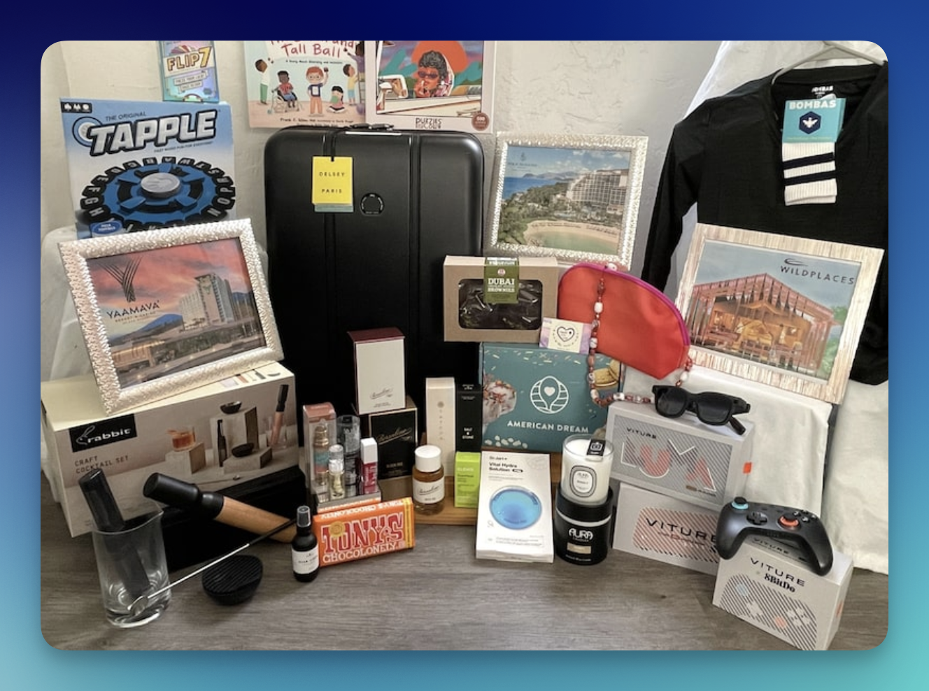 - Prize 2: Items from CHAOS Candle Company, IPSY, Made By Mimi Designs, Molly Bz Cookies, The Op Games (TAPPLE + Flip 7), Tony’s Chocolonely, VITURE XR glasses bundle, WildPlaces Africa (tote included), and Yaamava’ Resort & Casino at San Manuel (hat included)