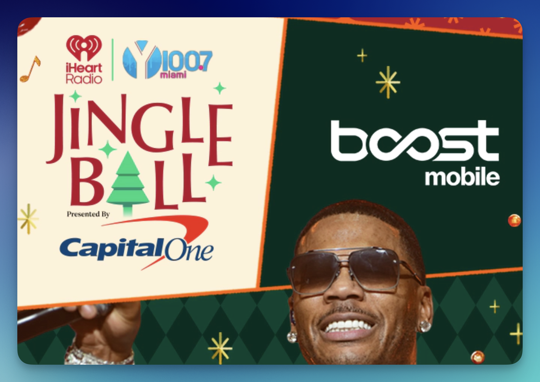 - (1) Winner – trip for two to Y100.7’s Jingle Ball in Miami including round-trip airfare, 2-night hotel stay, 2 event tickets, 2 Boosts artist experience passes, Jingle Ball merch gift bag, and a $1,000 prepaid gift card (ARV $4,500)