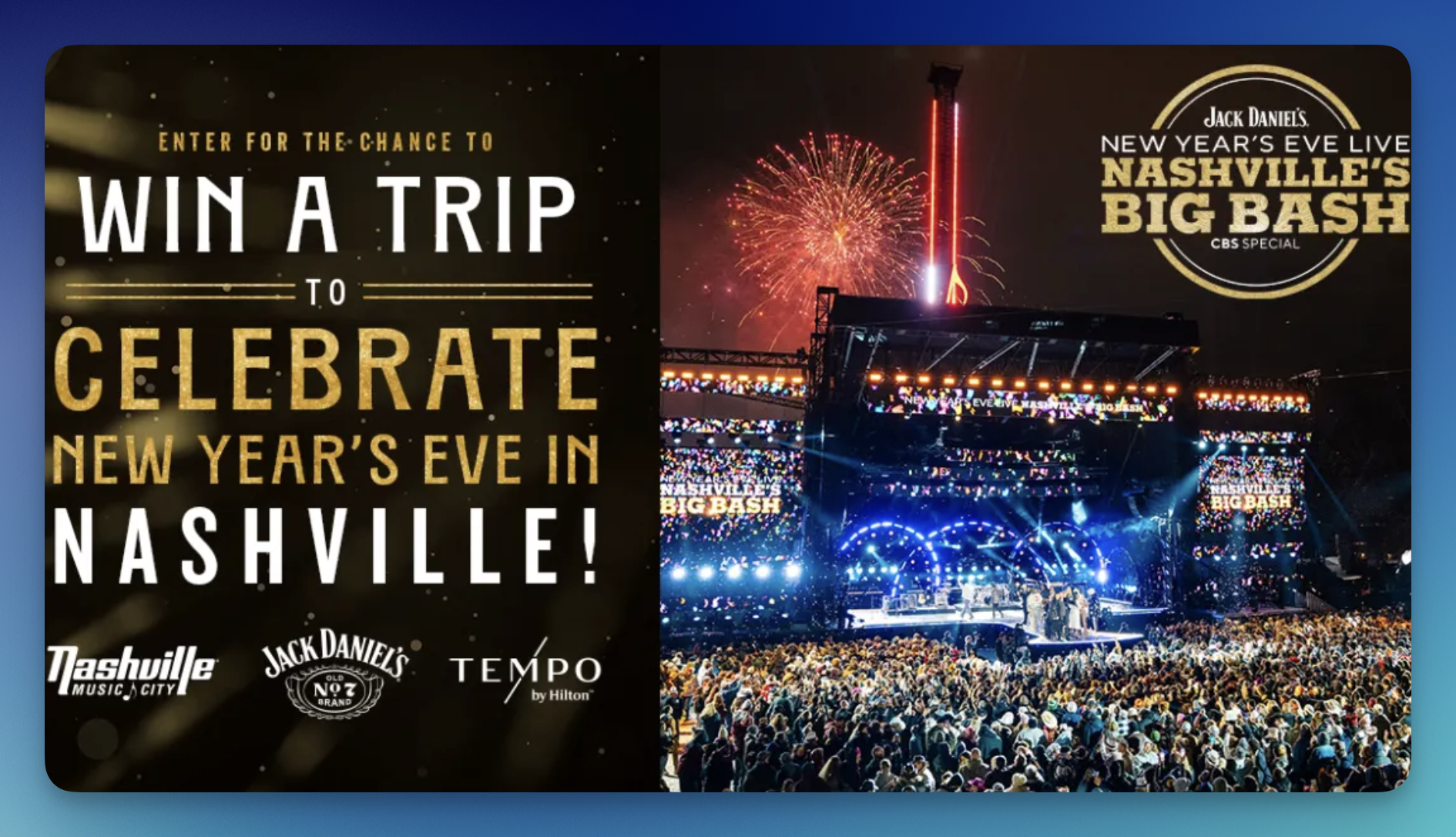 • (1) Winner – round-trip domestic coach airfare for two to Nashville, 3-night stay at Tempo by Hilton Downtown Nashville (Dec 30–Jan 2), two Special Viewing Passes for Jack Daniel’s New Year’s Eve Live: Nashville’s Big Bash, a Music City Attraction Pass for two, and a Music City gift bag (ARV $5,113)