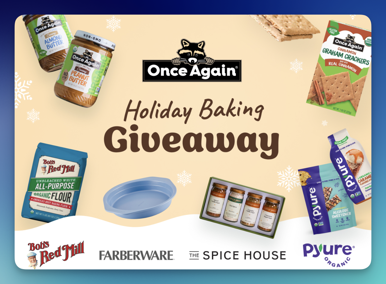 (1) Winner – 3 boxes of Once Again Graham Sandwiches, 4 full-size Once Again nut and seed butters, assorted Pyure sweeteners and syrups, Farberware Easy Solutions bakeware set, Spice House spiced sugars collection, and Bob’s Red Mill organic & gluten-free flours