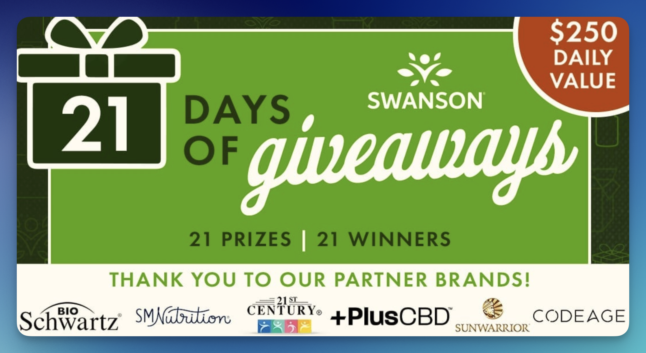 Fuel your wellness journey with the Swanson Health “21 Days of Giveaways” Sweepstakes — 21 winners will each take home a $250 prize pack full of Swanson vitamins, supplements, and wellness goodies! Feel free to share your referral links in the comments section. Good luck!