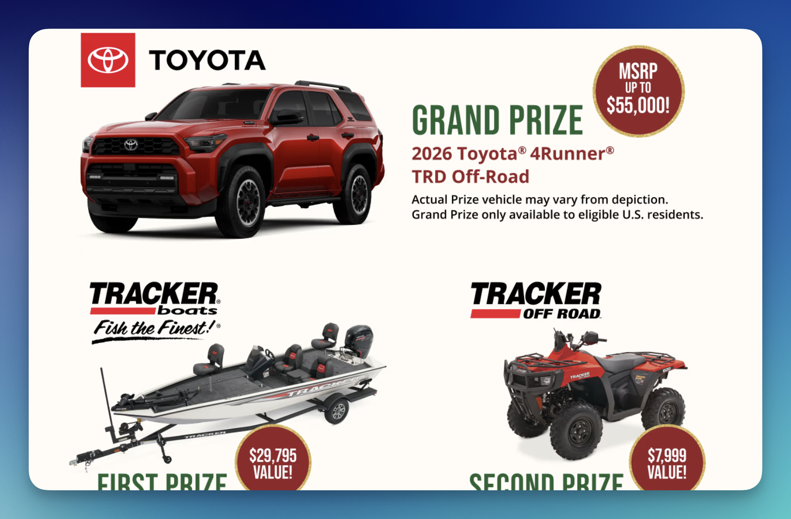 • Grand Prize: 2026 Toyota 4Runner TRD Off Road (MSRP up to $55,000)
