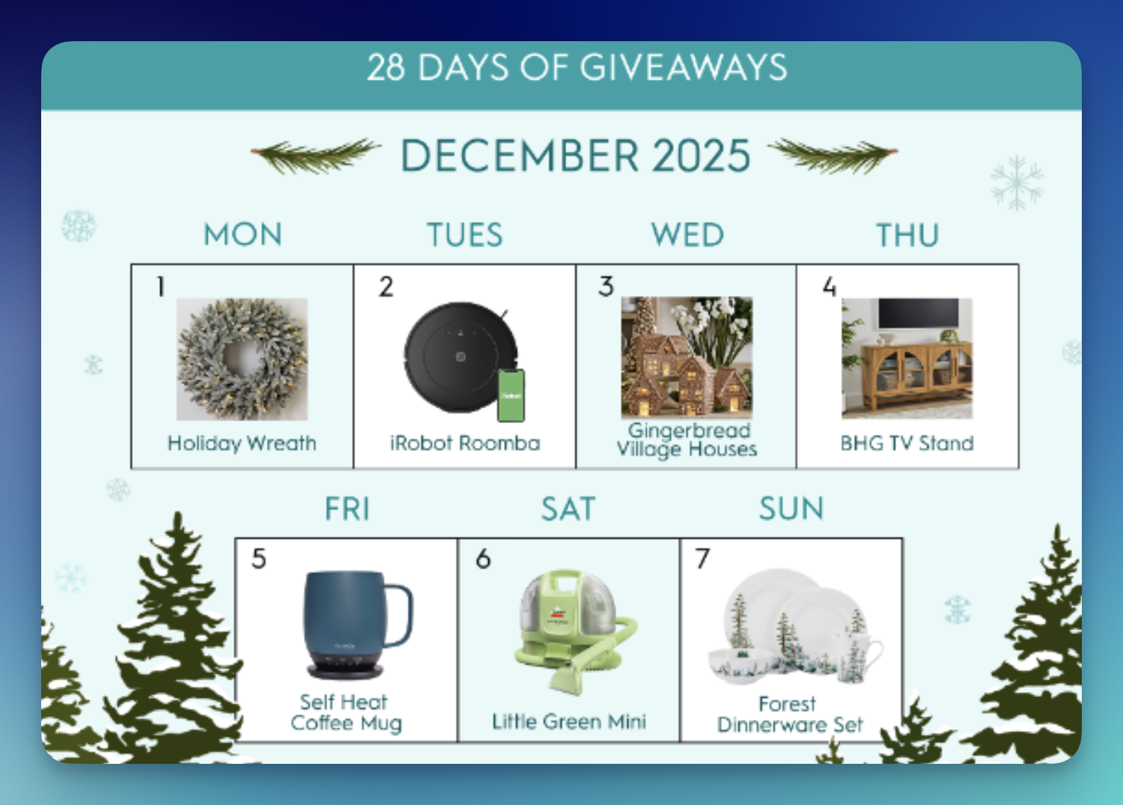 The holidays just got way more exciting because BH&G “Winter Wonderland” Sweepstakes is giving out 28 total prizes — one new gift every single day through December!