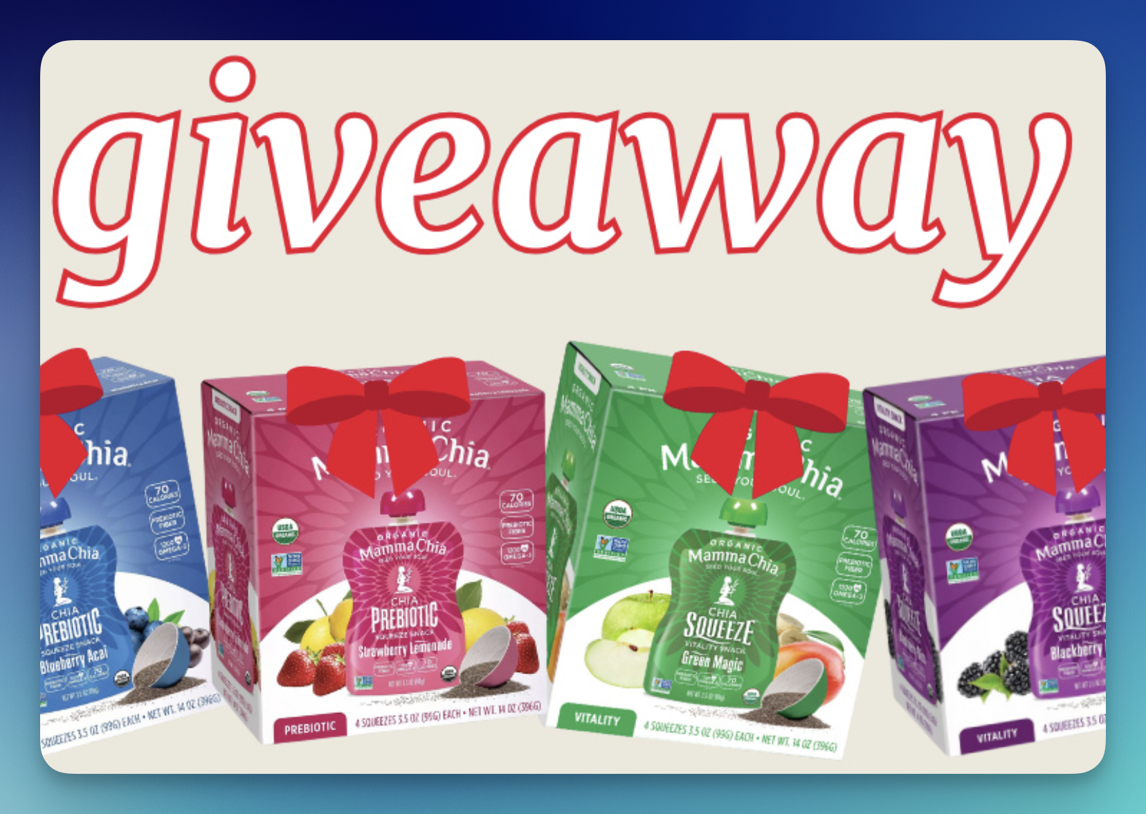 Holiday cheer and tasty prizes are up for grabs with the Mamma Chia Happy Holidays Instagram Giveaway, featuring 5 total prizes including gift cards and chia snacks!