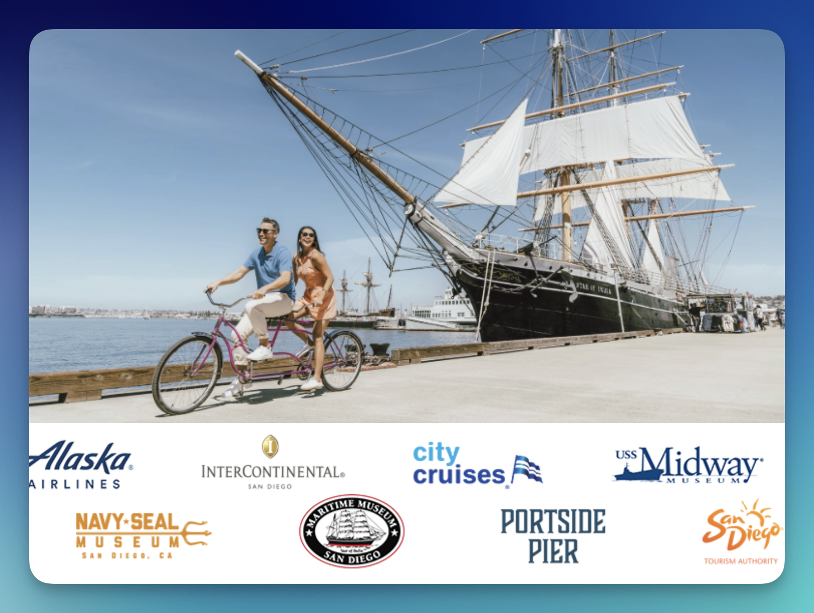 (1) Winner will receive round trip first class airfare vouchers for two to San Diego on Alaska, Hawaiian, Horizon, or SkyWest, two (2) nights at the InterContinental San Diego by IHG, a $100 dining gift card for Portside Pier, admission and a bay tour at the San Diego Maritime Museum, tickets to the USS Midway Museum and the Navy SEAL Museum, plus a $200 City Cruises certificate for a non special event cruise