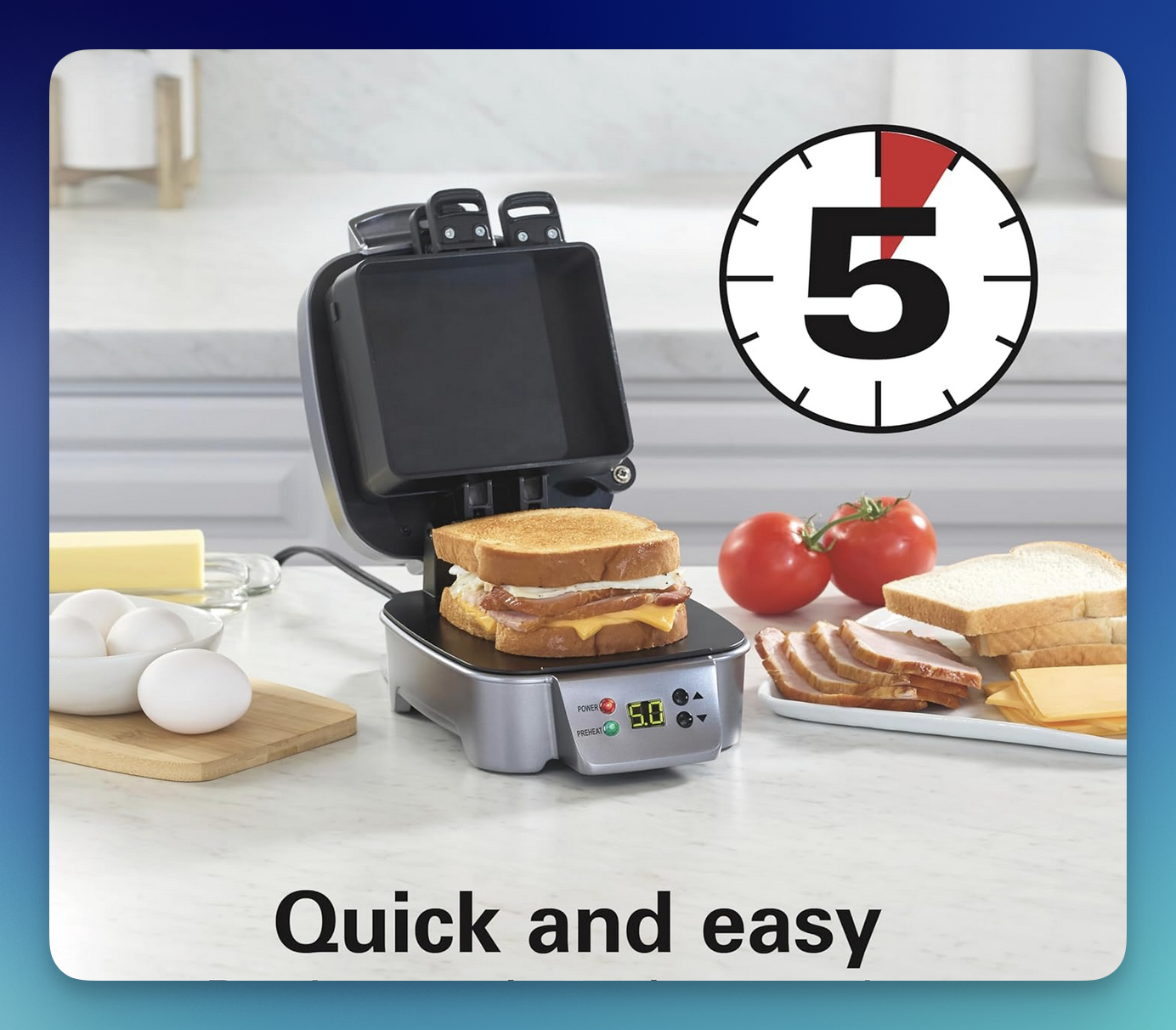 (1) Winner will receive a Hamilton Beach Sandwich Stacker Hot Sandwich Maker in silver featuring nonstick PFAS-free cooking surfaces and a built-in timer with an approximate retail value of $49.99