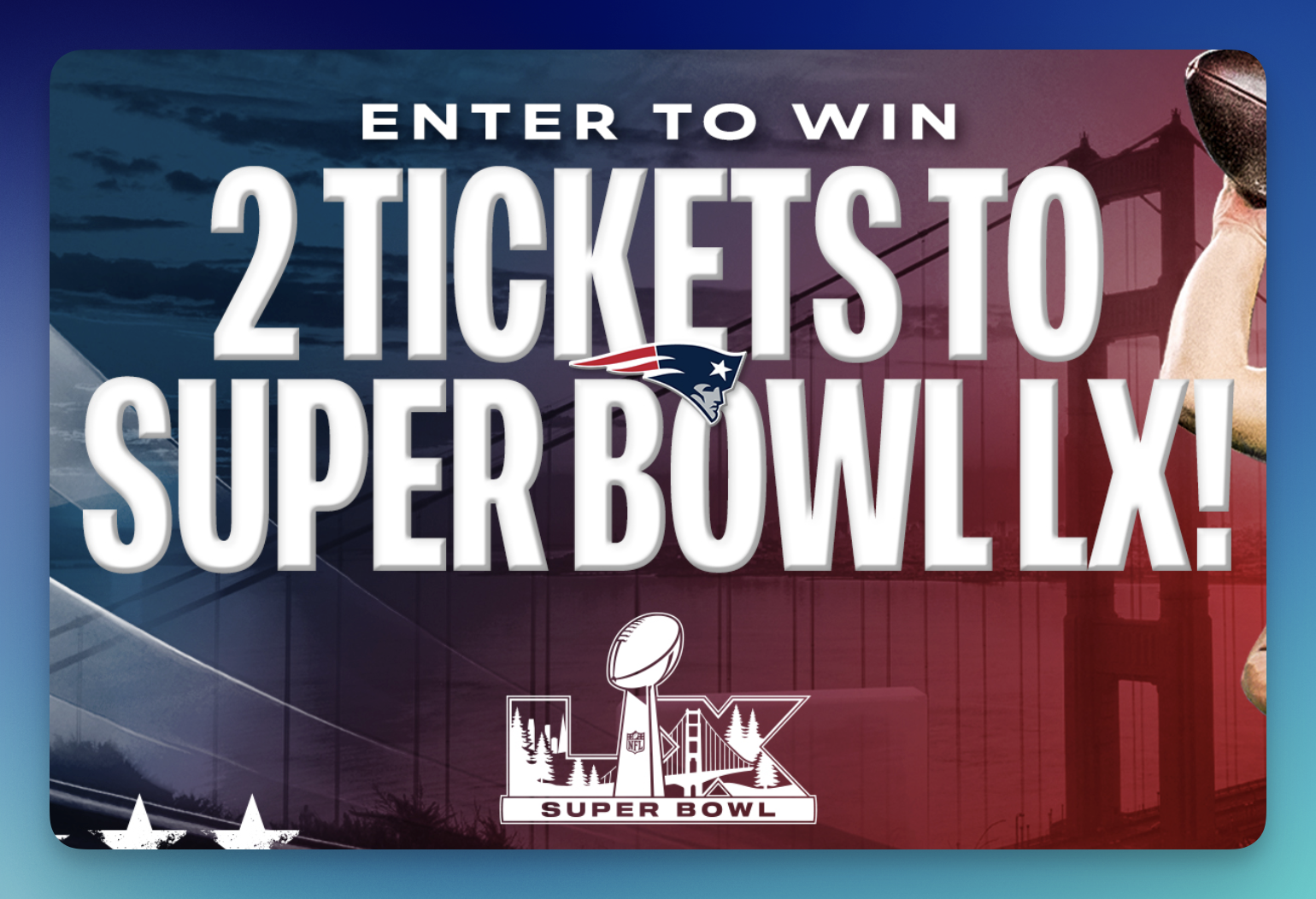 A trip to football’s biggest game is on the line with the New England Patriots Super Bowl Tickets Sweepstakes, featuring 1 total prize that includes two tickets to Super Bowl LX in Santa Clara, California!