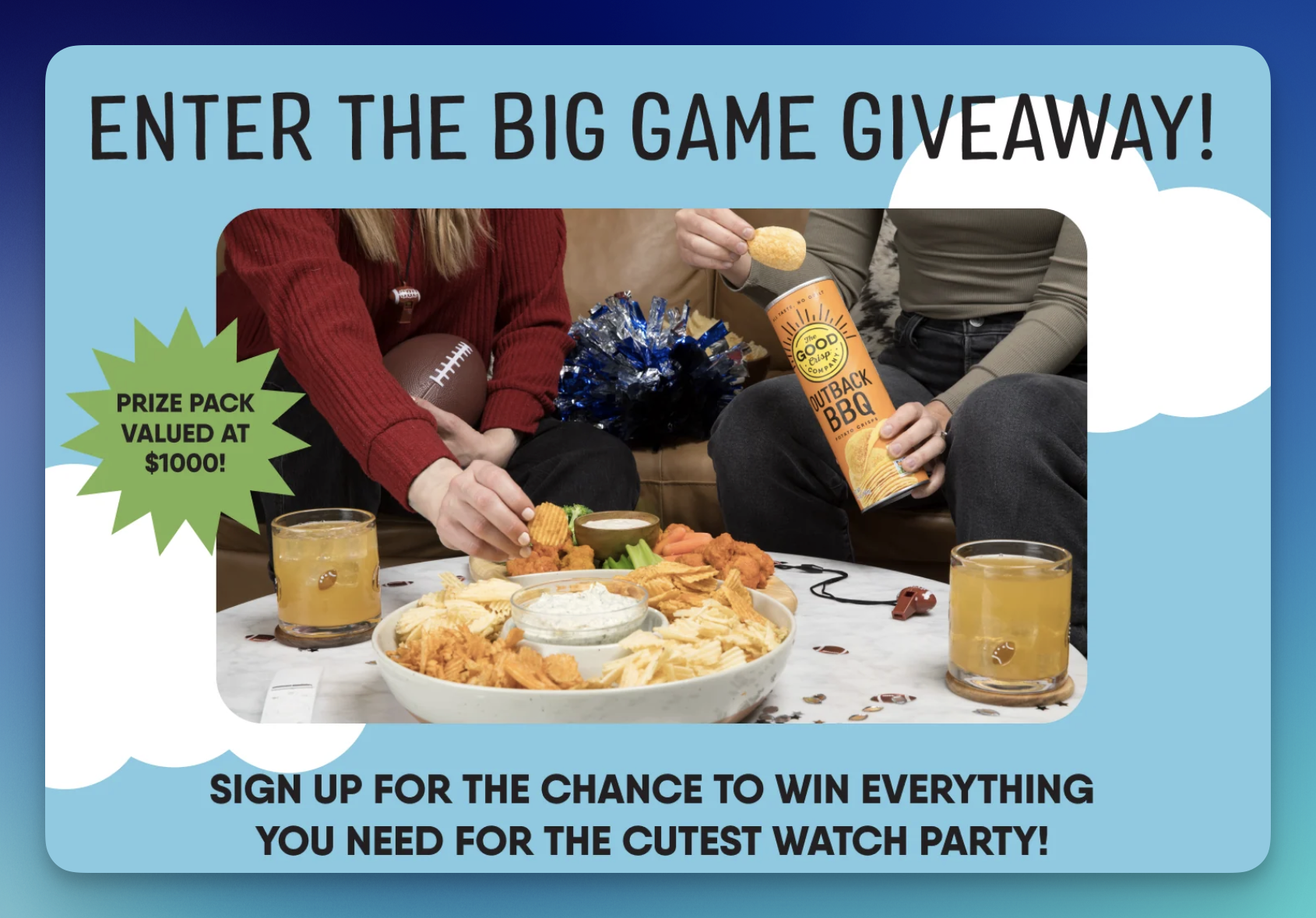 Game-day hosting just got an upgrade with The Good Crisp Big Game Sweepstakes, awarding 1 total Grand Prize packed with snacks and stylish serveware!