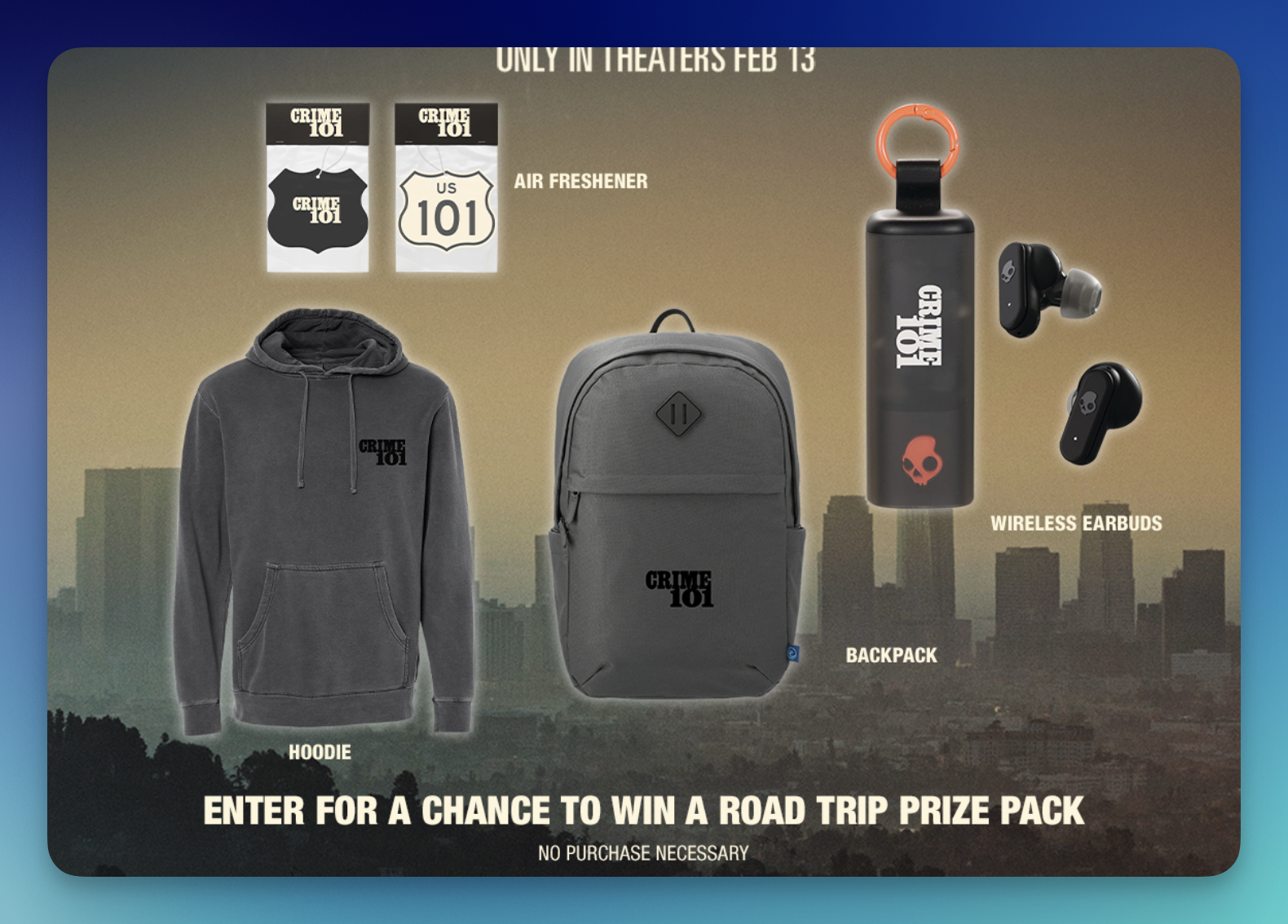10 winners will each receive a Crime 101 prize pack including wireless earbuds, a hoodie, a backpack, and an air freshener with a total prize value of $250