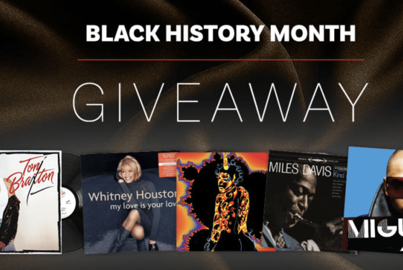 3 Winners will each receive a vinyl bundle including OutKast – Stankonia (25th Anniversary 3LP), Whitney Houston – My Love Is Your Love, Miguel – All I Want Is You, Toni Braxton – Toni Braxton, and Miles Davis – Kind Of Blue