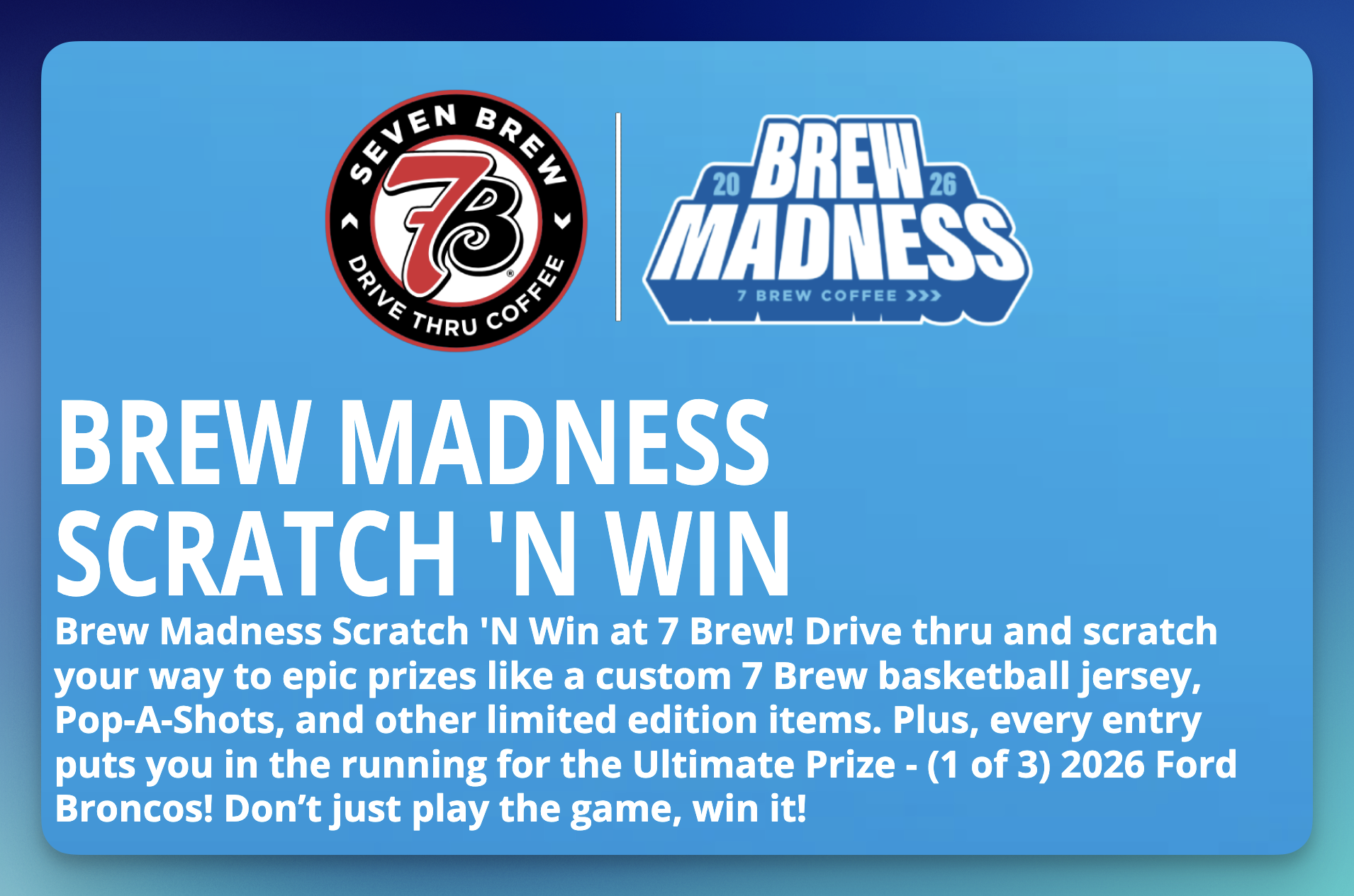Three Grand Prize Winners will each drive away in a 2026 Ford Bronco (ARV $57,000 each), with drawings on March 16, March 23, and April 1, 2026. Plus, players can instantly win free drinks, discounts, merch, and more throughout the promotion.