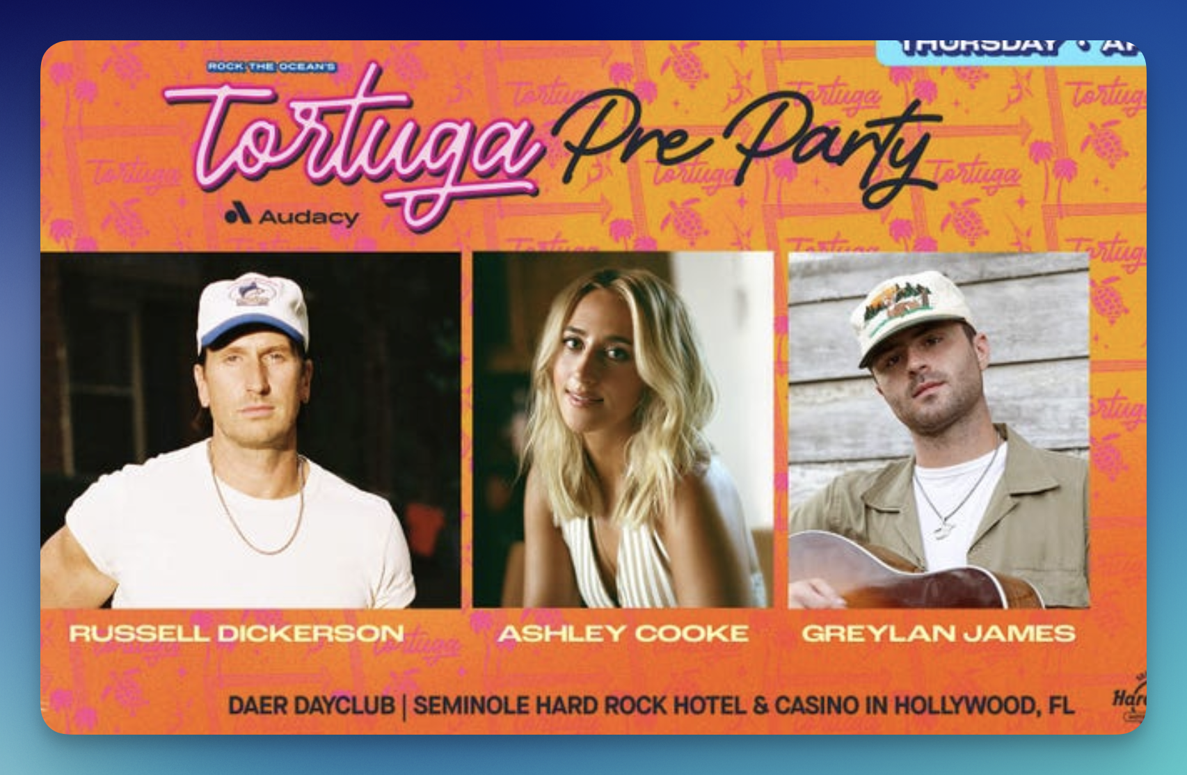 - 1 Grand Prize winner will receive a pair of 3-day passes to Rock the Ocean’s Tortuga Music Festival (April 10-12) featuring Kenny Chesney, Riley Green, Post Malone and more, roundtrip airfare to Fort Lauderdale, FL, a 5-night hotel stay at Seminole Hard Rock Hotel & Casino Hollywood, and exclusive access to Audacy’s Tortuga Pre-Party on April 9