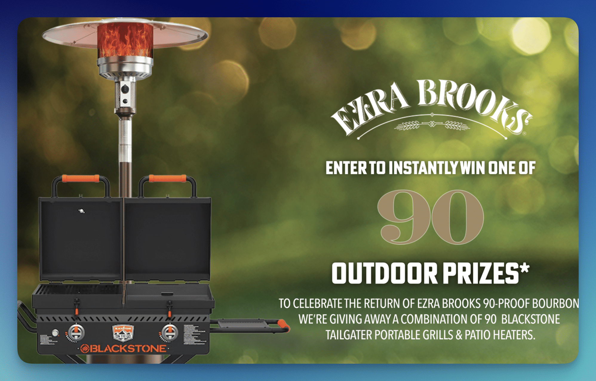 Ninety reasons to enter with the Ezra Brooks “90 Prizes for 90 Proof” Sweepstakes, giving away 90 total prizes including grills and outdoor heaters across multiple entry periods!