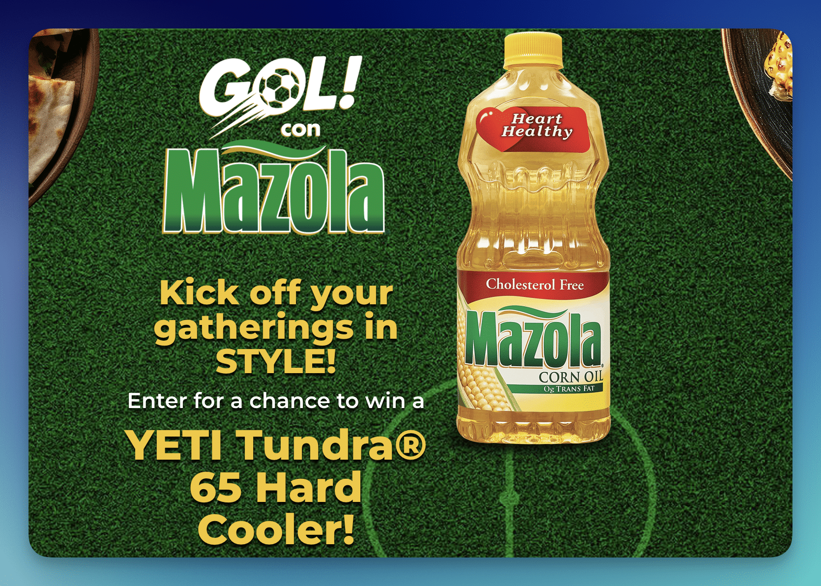 Kick off every gathering in style with the Gol con Mazola “Kick off Your Gatherings” Sweepstakes for a chance to win 1 of 56 prize packages!