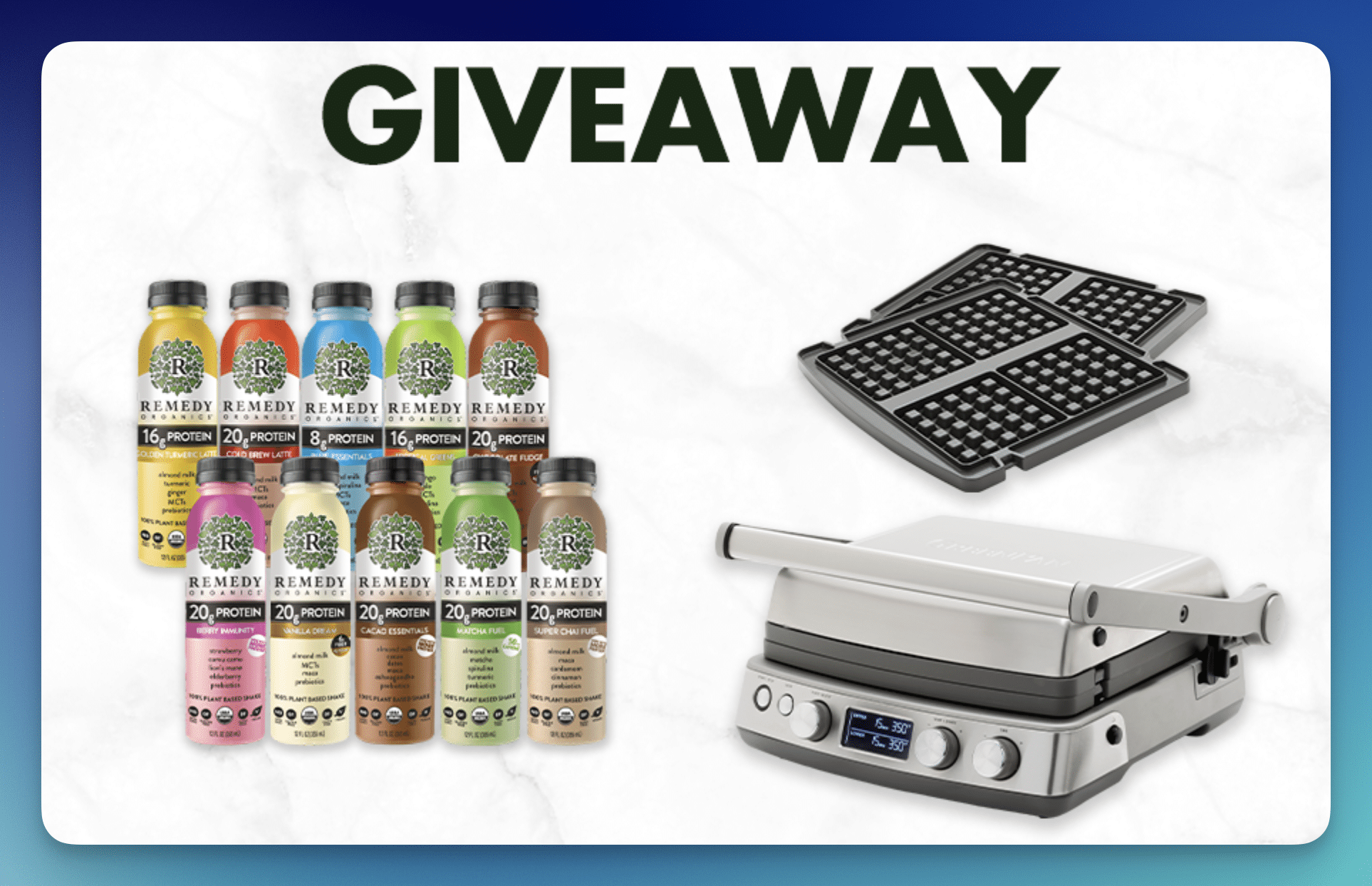 - 1 winner will receive a GreenPan Elite Multi Grill & Griddle with Waffle Plates and a Remedy Organics Remedy Wellness Shake Assortment (ARV $500+)