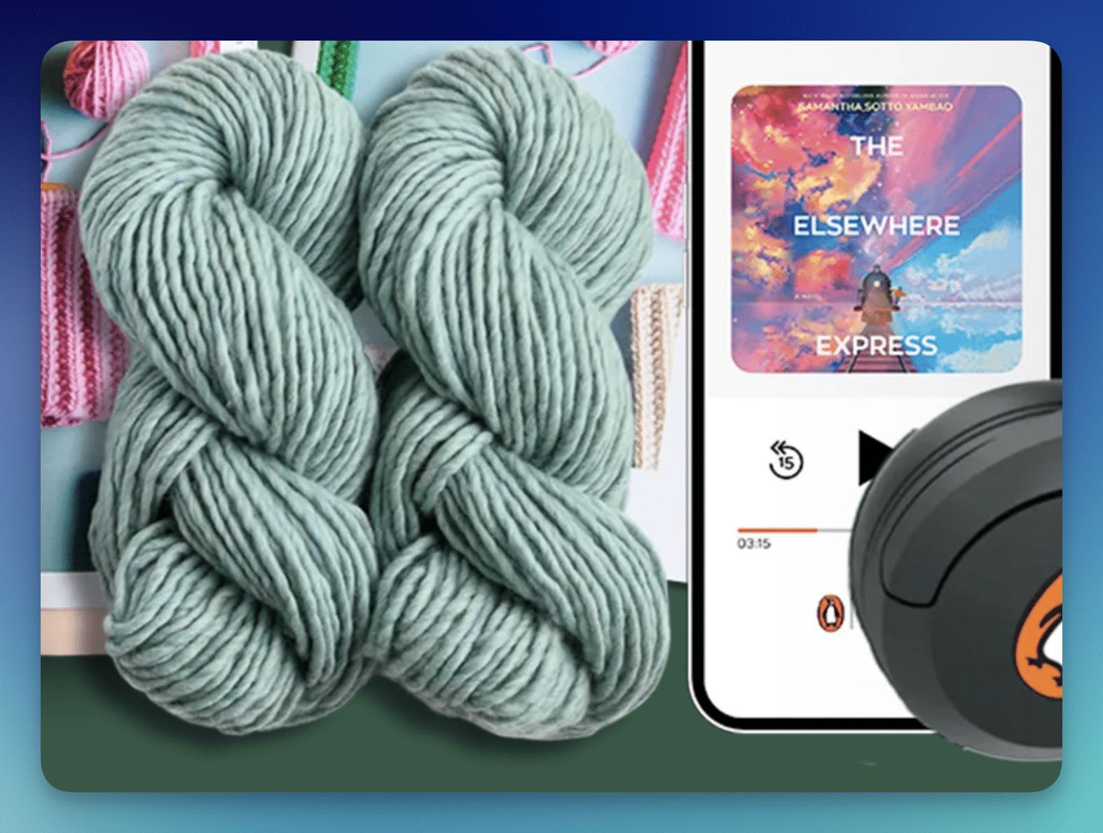 - 1 Knit Kit Grand Prize winner will receive a Learn to Knit a Cowl Kit from Purl Soho, PRH Audio branded wireless headphones, and an audiobook download of “The Elsewhere Express” by Samantha Sotto Yambao (ARV $158.75)