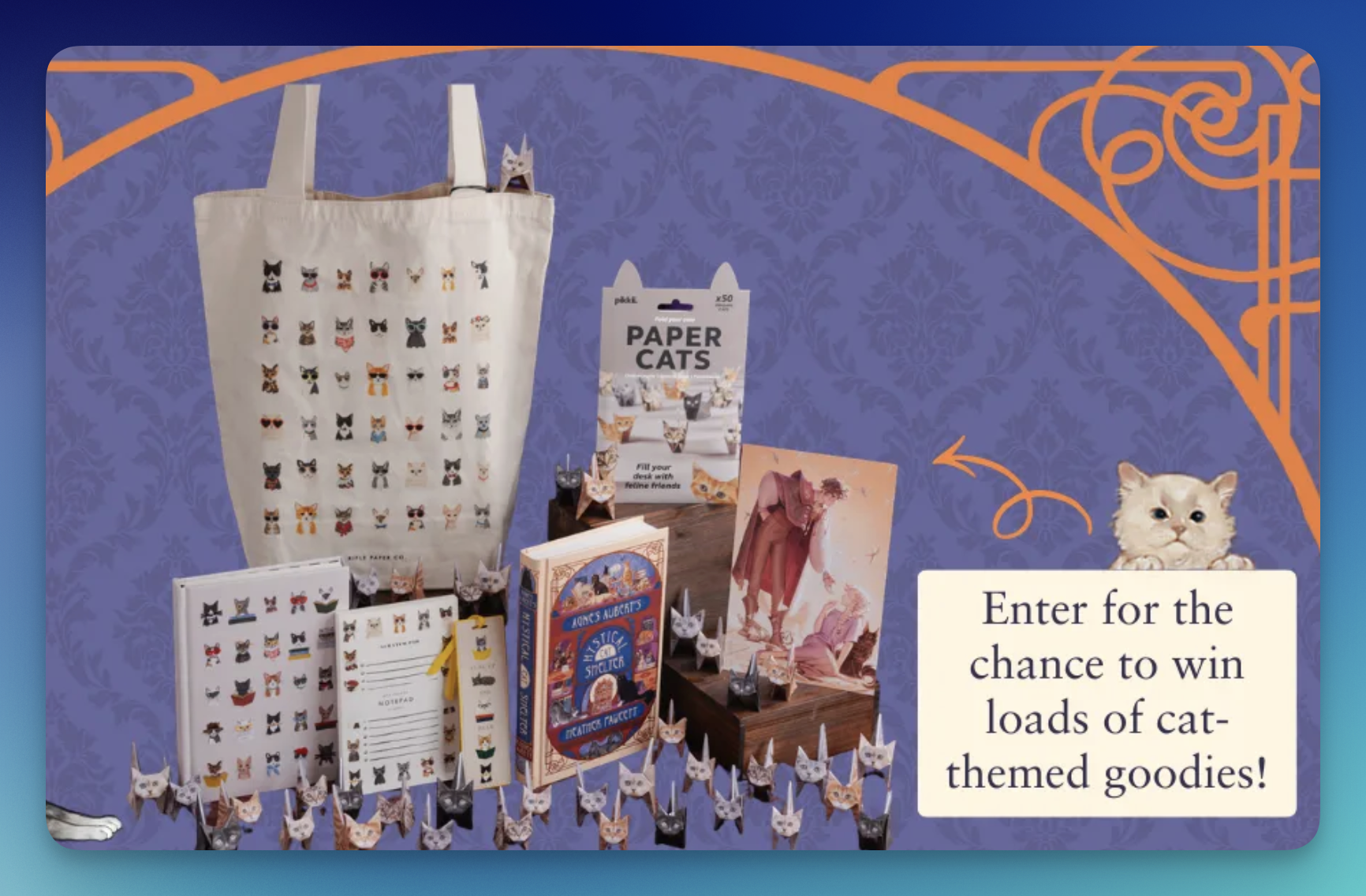 - (5) winners will each receive a copy of Agnes Aubert’s Mystical Cat Shelter by Heather Fawcett, an Agnes and Havelock Art Print from rosiethorns88, Paper Cats from Pikkii Design, a cat tote bag, a cat notepad, a cat bookmark, and a cat embroidered journal, ARV $129.01 each