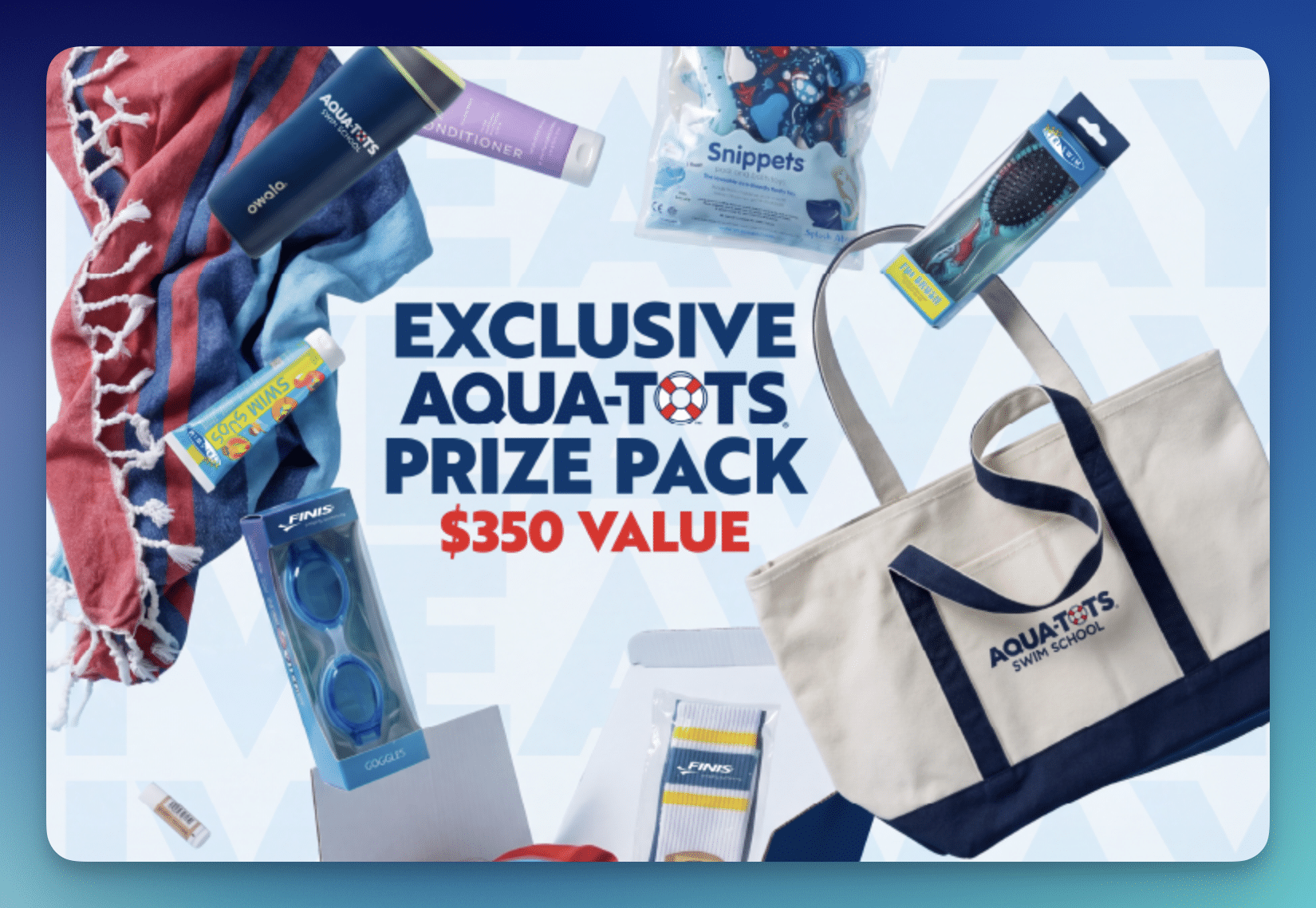 - (35) Winners will each receive a prize pack including a $150 Aqua-Tots Swim School gift card, an Owala SmoothSip Slider, an Aqua-Tots tote bag, Finis Adventure Goggles, a Finis Animal Head Swim Cap, Finis Retro Crew Socks, a bag of Dum Dums, a Dum Dums keychain, Dermasport Lip Balm, TriSwim Kids Swim Suds 2-in-1 Shampoo Body Wash, TriSwim Kids Conditioner, a TriSwim Fun Brush, a Lane Linen Turkish Beach Towel, and two Snippets Pool and Bath Toys, ARV $350 each; Total ARV: $12,250