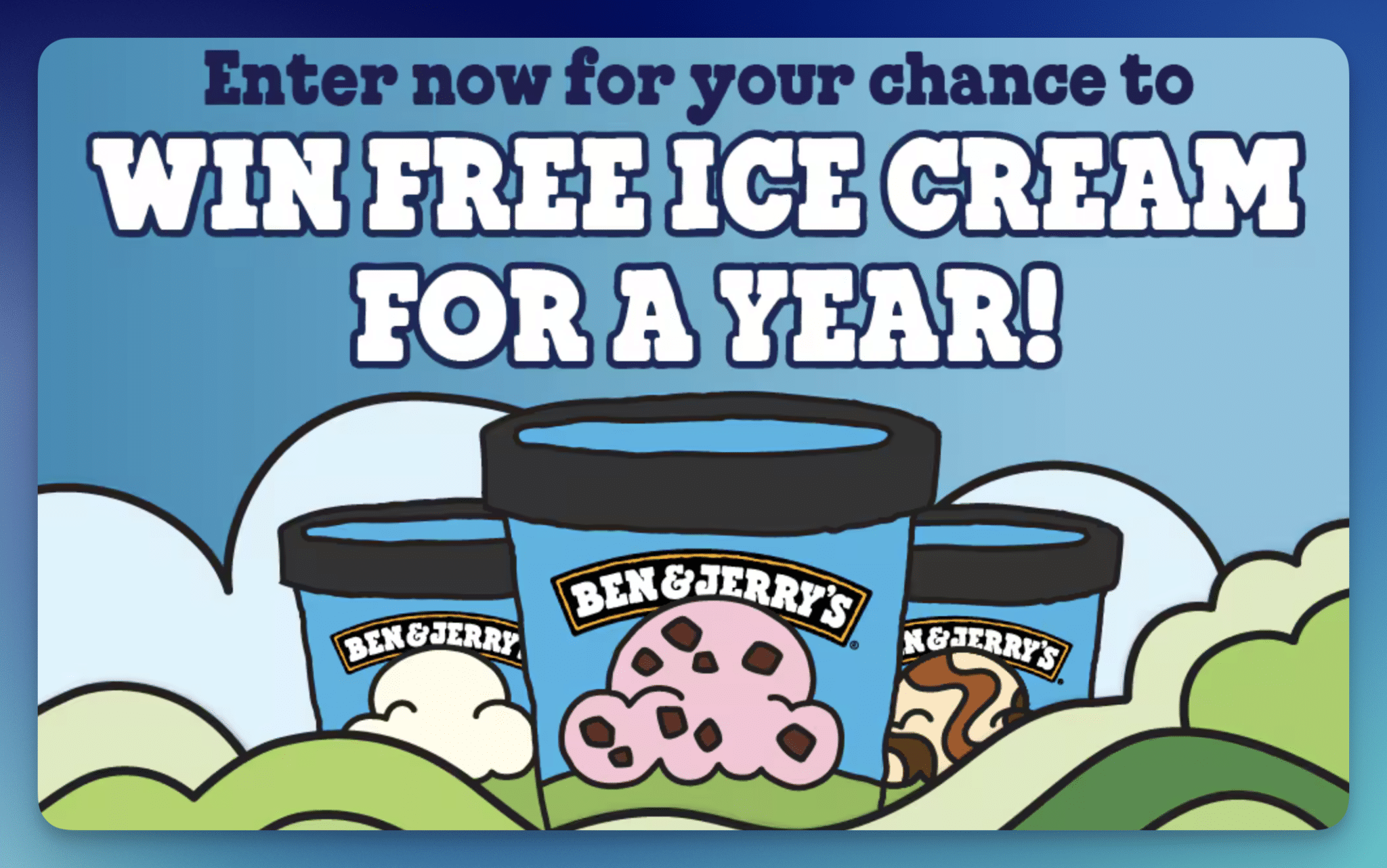Scoop up a sweet year of ice cream with the Ben & Jerry’s “Free Cone Day” Sweepstakes, offering 5 winners a full year of Ben & Jerry’s!