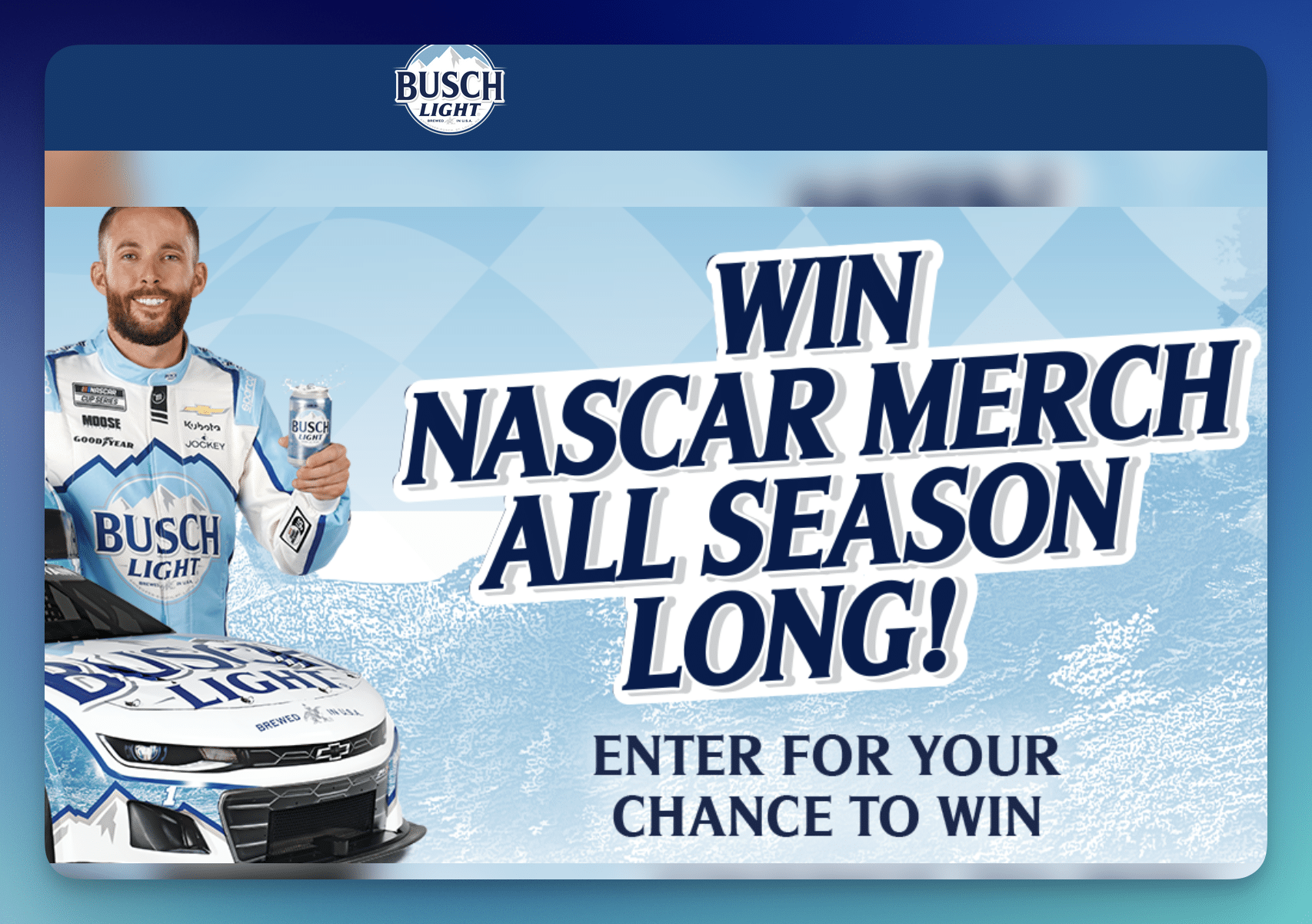 Rev up for a chance to win with the Busch Light “Busch Racing” Sweepstakes, offering 600 winners a branded cooler and hat!