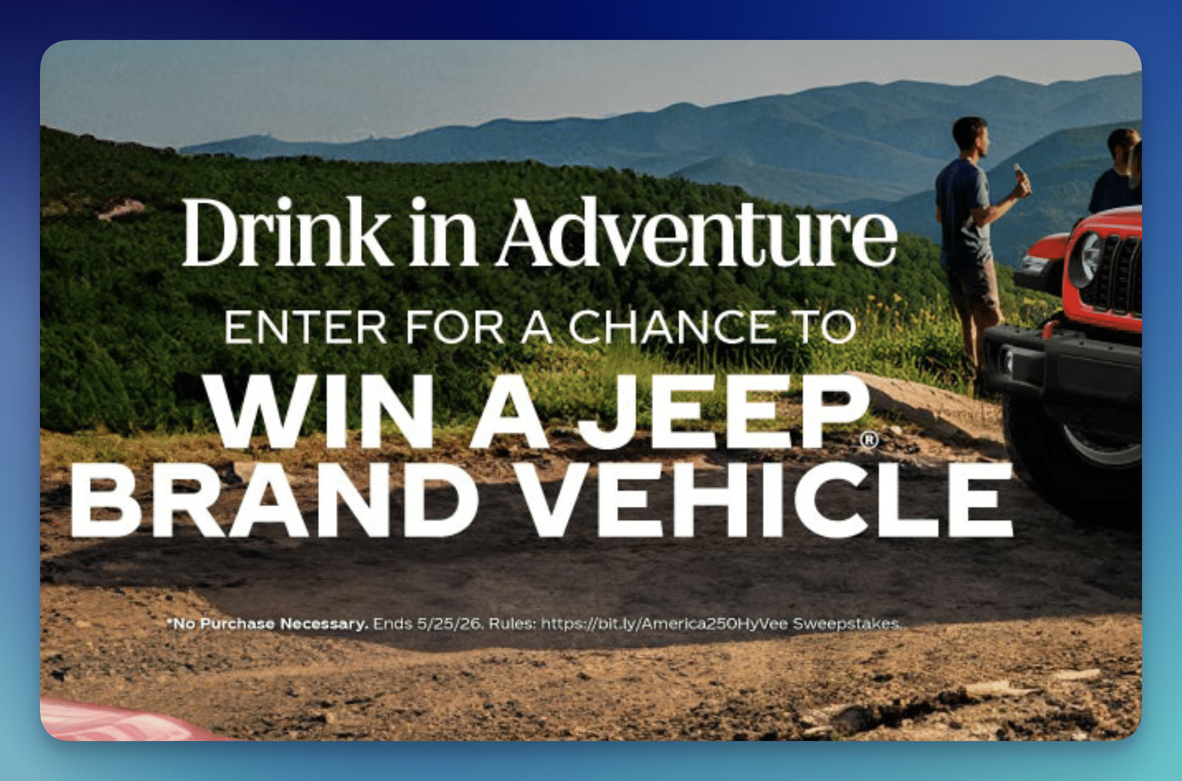 Drive into summer with the Coca-Cola “America 250 Hy-Vee” Sweepstakes, offering 1 winner a $60,000 Jeep vehicle credit!