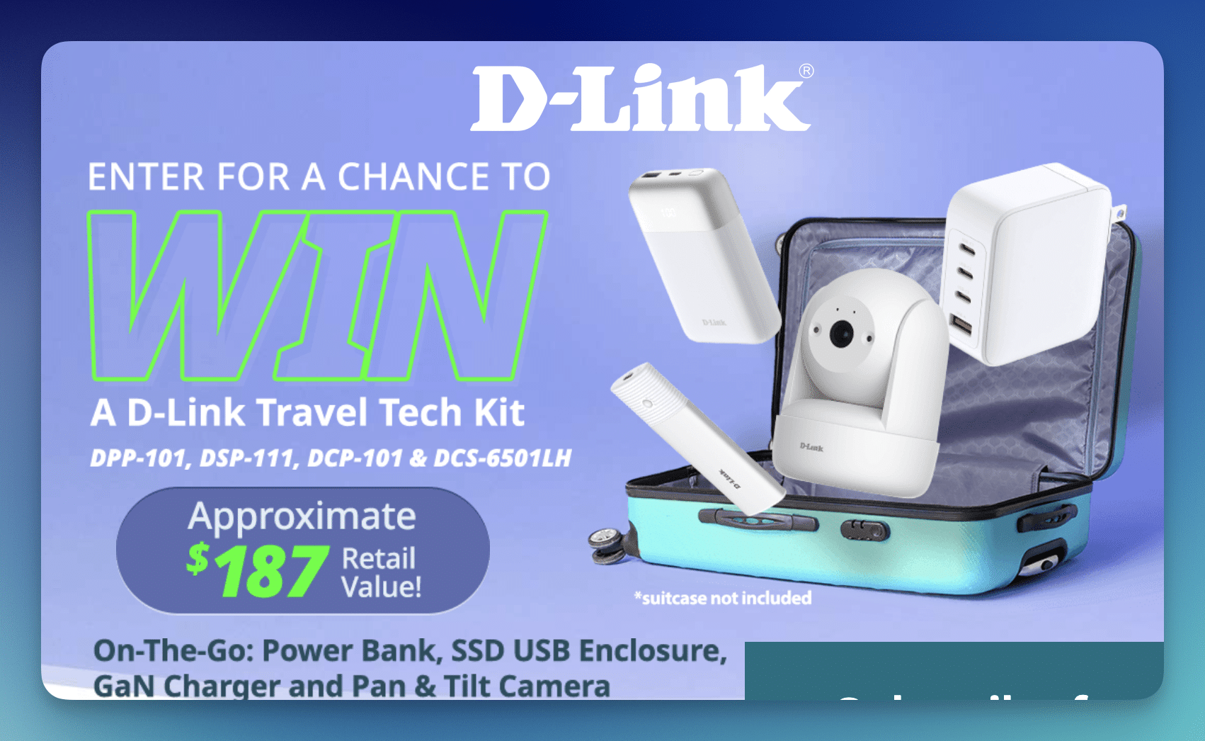 - (1) winner will receive a D-Link Travel Tech Kit including a Pan & Tilt Camera, USB-C M.2 NVMe/NGFF SSD Enclosure, 10000mAh Power Bank, and 100W Multi-Port GaN Charger