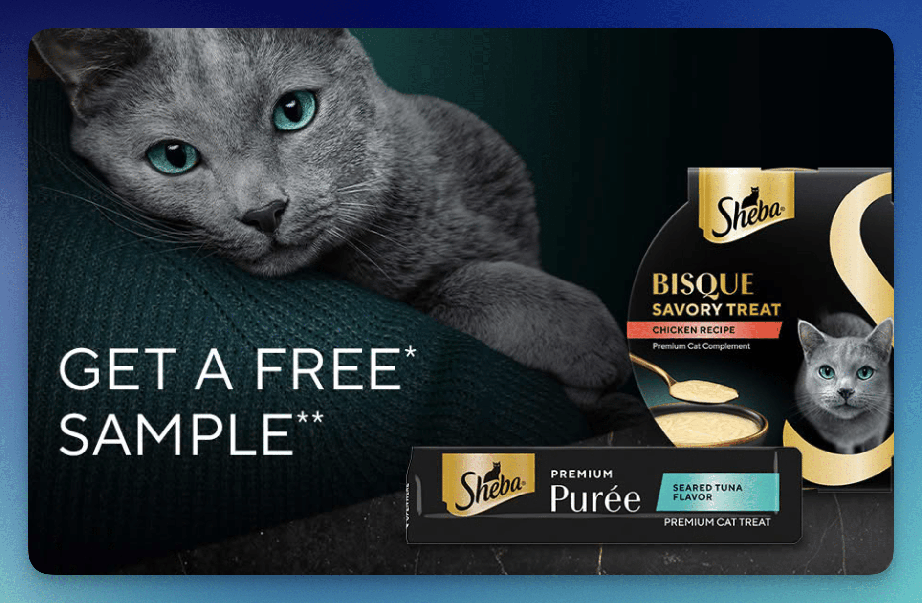 Hurry over to request a FREE Sample of SHEBA Bisque or Purée! Just fill out the short form to claim yours. Expect this to arrive within 6 weeks!