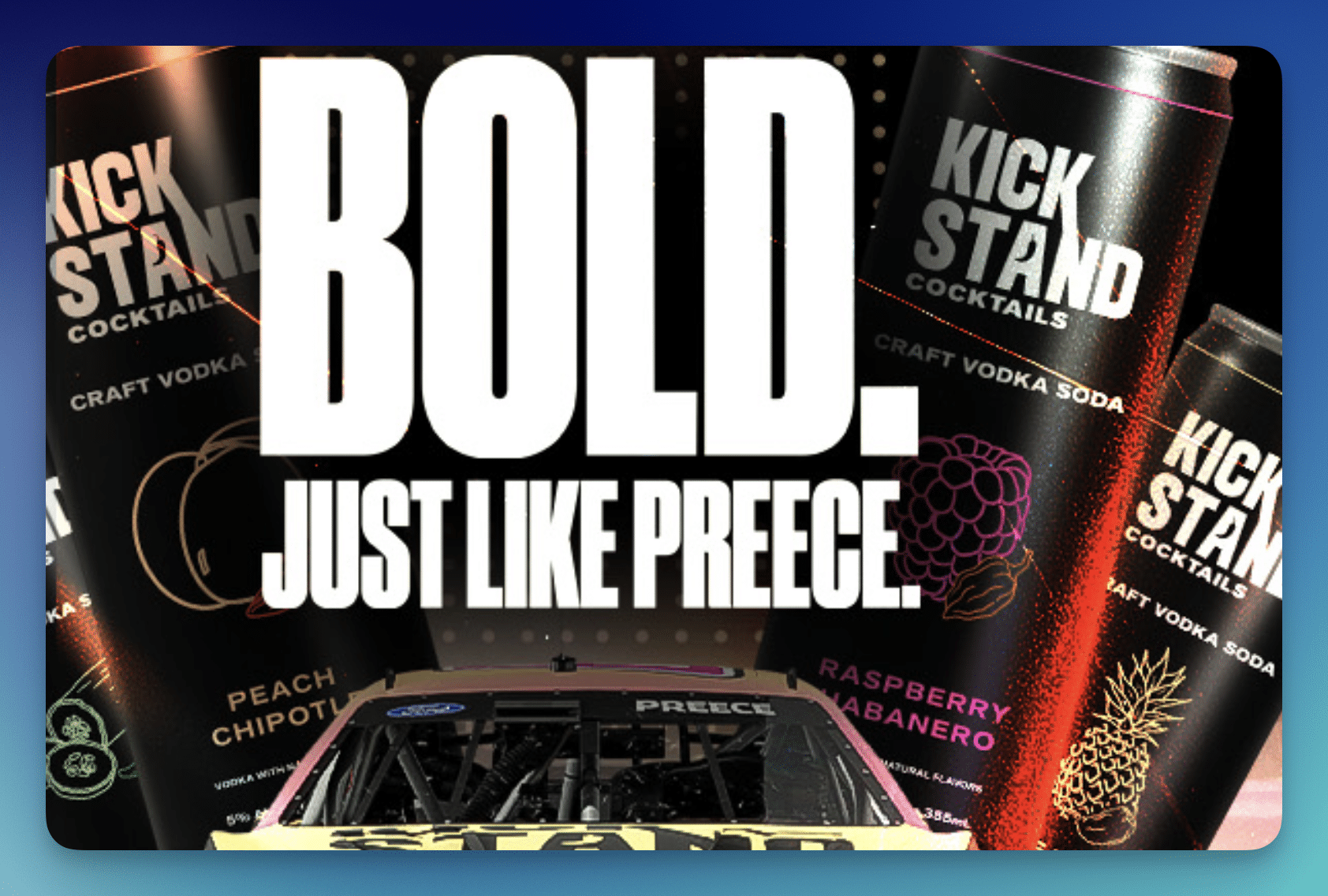 - (8) winners will each receive a Kickstand Cocktails gear pack including a Solo Stove Mesa and Ryan Preece trading card, ARV $105 each