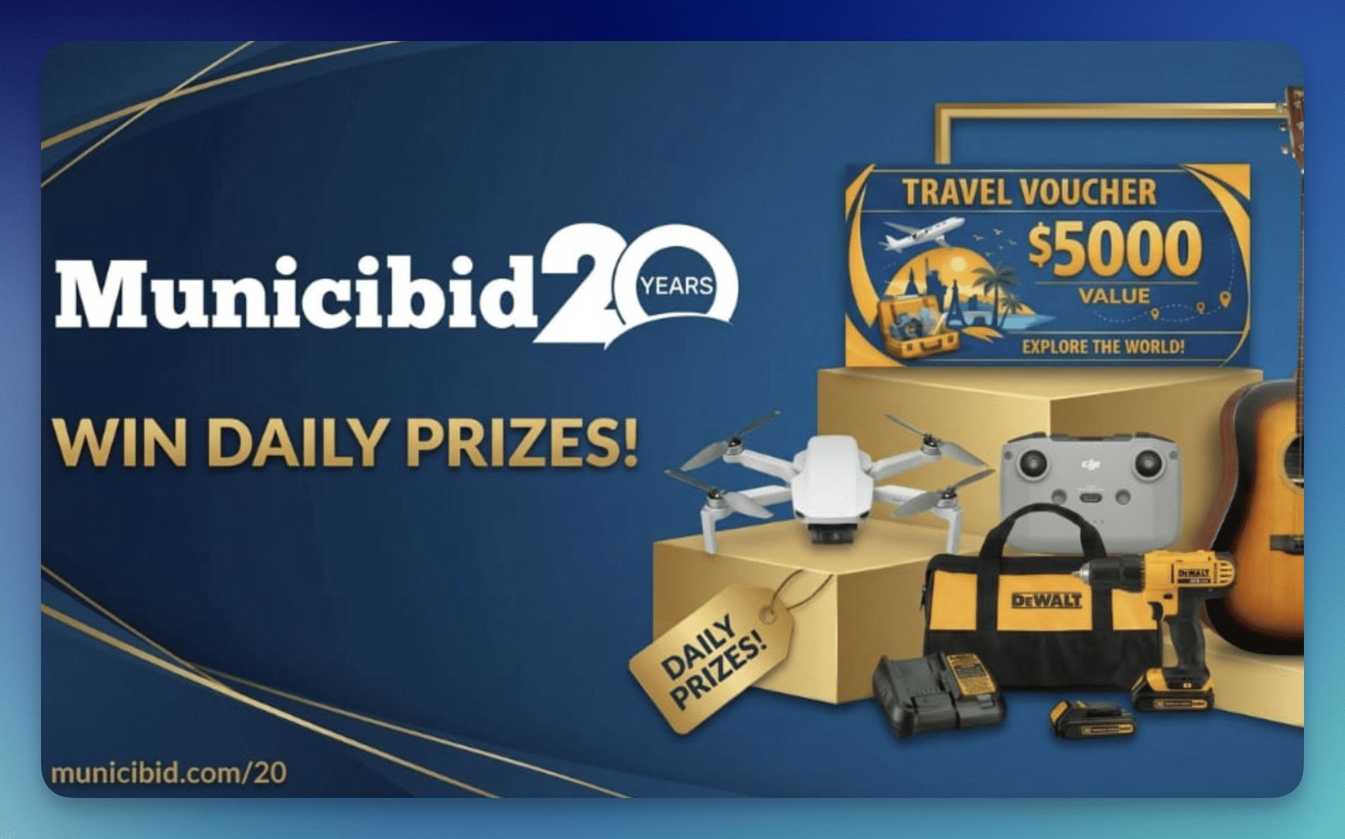 Win something new every day with the Municibid “20 Days” Sweepstakes, offering 165 total winners daily prizes building up to a $5,000 travel voucher grand prize!