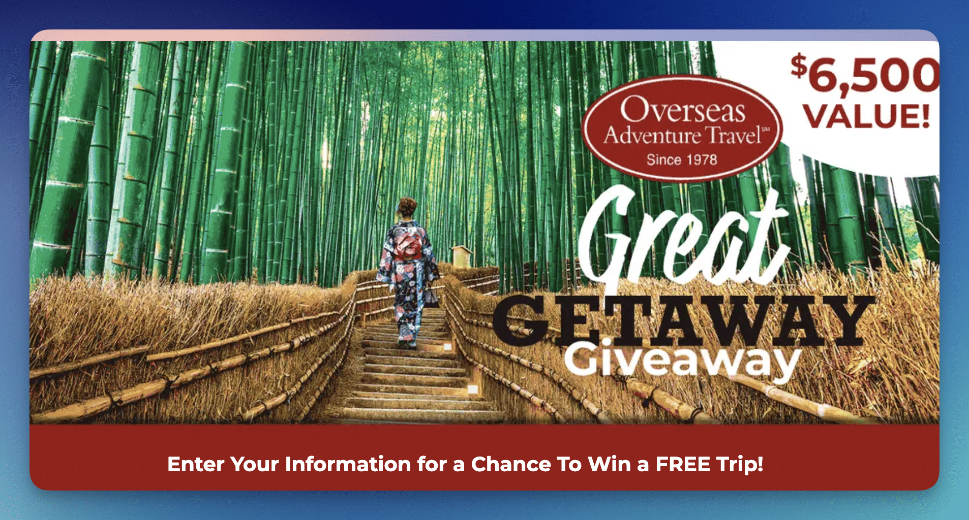 - (3) Grand Prize winners will each receive a solo travel adventure valued at up to $6,500 including airfare, redeemable toward Overseas Adventure Travel destinations including Africa, Asia, Patagonia, and Italy