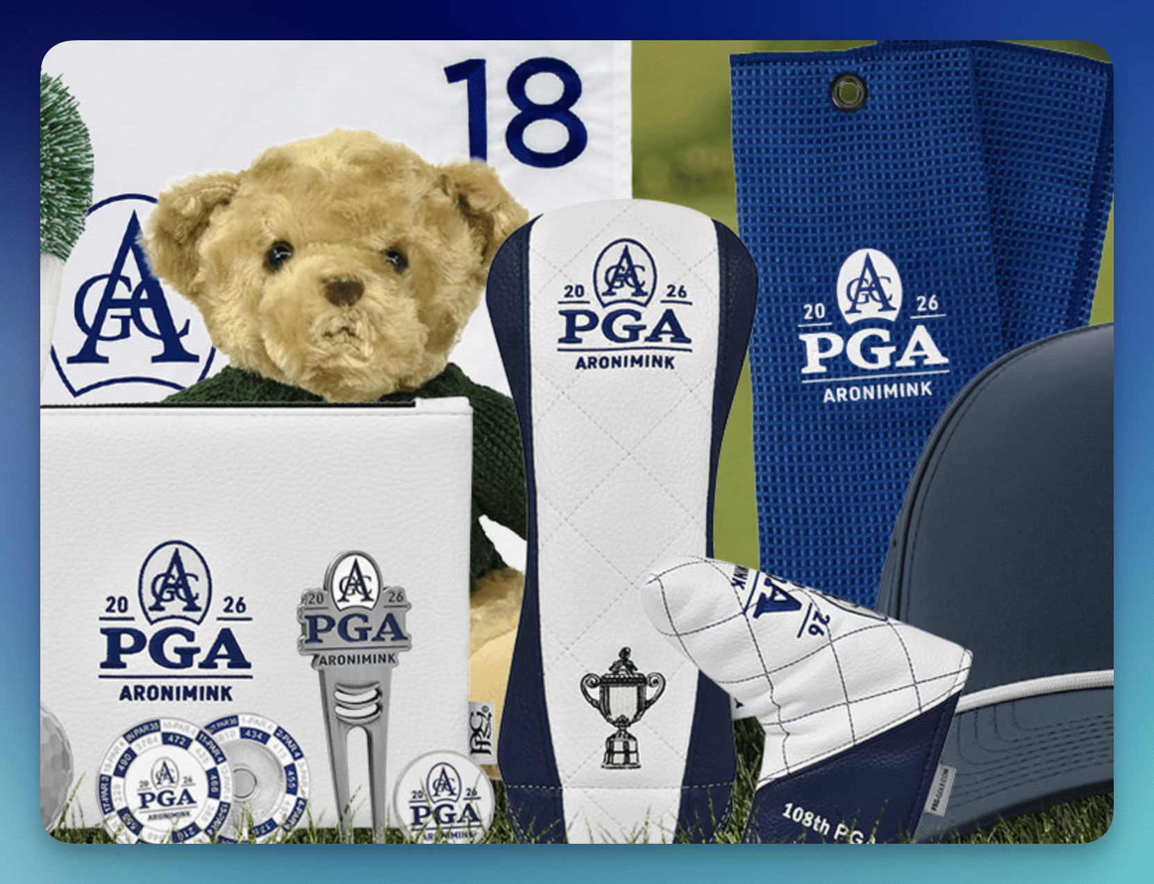 - (1) winner will receive a 2026 PGA Championship accessories bundle including a divot tool and ball marker set, plush bear, zip top pouch, quilted driver, blade, and rescue covers, pom headcover, embroidered microscrubber towel, bespoke bag tag, yardage duo ball marker, 4-piece ball marker set, embroidered pin flag, ProV1 3-pack golf ball sleeve, and an Eagle Performance Rope Hat, ARV $526