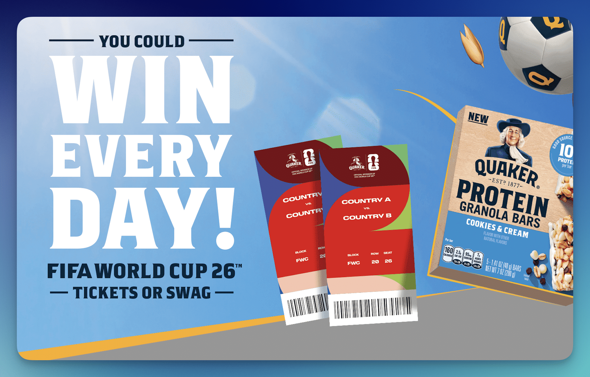 The world’s biggest stage is calling with the Quaker “FIFA World Cup 26” Instant Win Game, giving away 1,679 total prizes including a trip to the FIFA World Cup Final and match tickets!