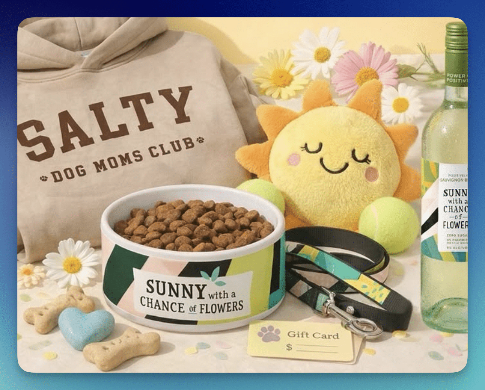 - (1) winner will receive Sunny branded ceramic dog bowls, a Sunny branded collar and leash set, a Salty Dog Moms (or Dads) Hoodie, and a $25 gift card for treats, ARV $200